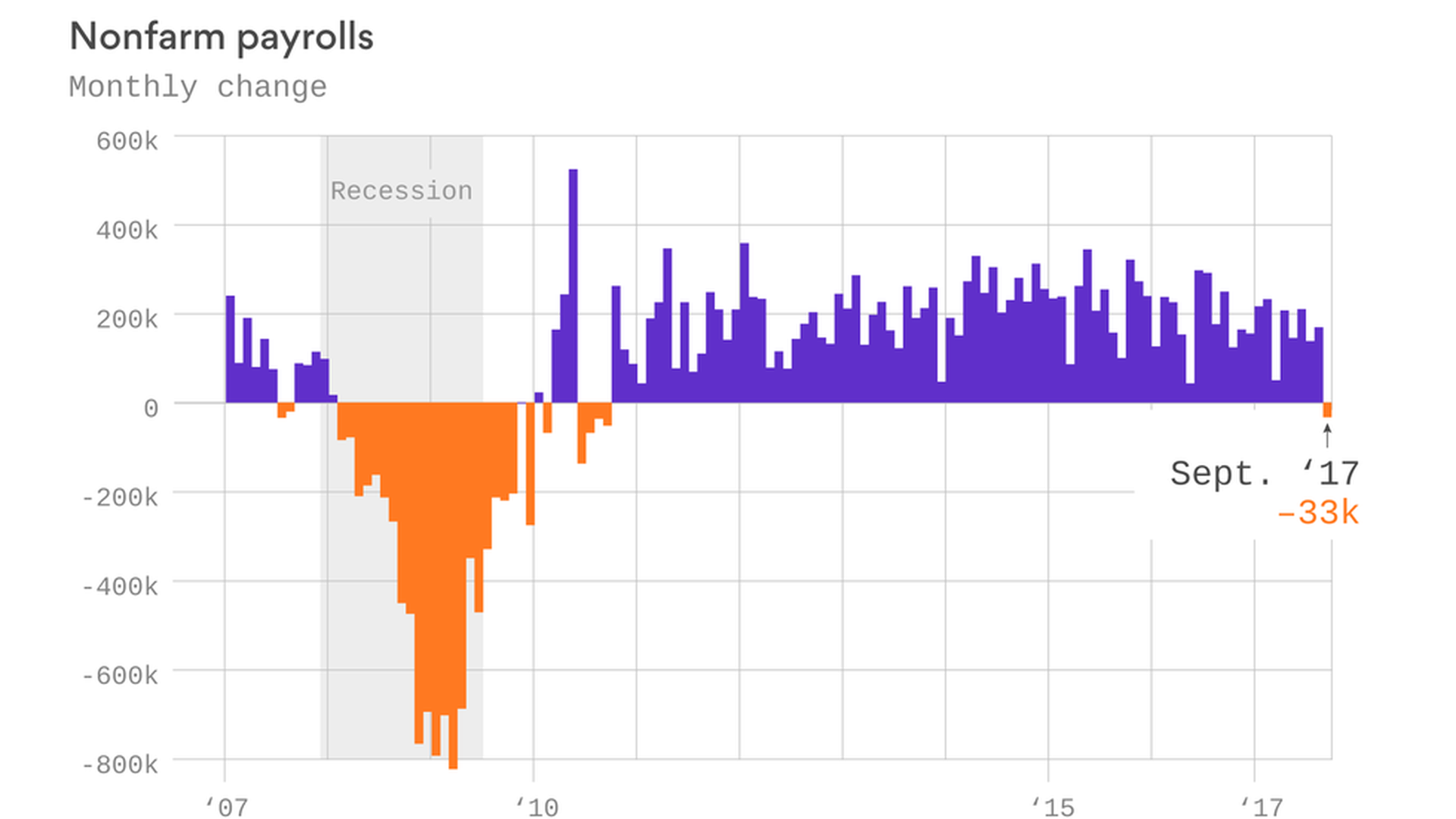 - Monthly jobs report: -33,000, vs. estimated +80k. Hurricanes took a major toll, although the past two months also got revised down. First monthly loss of jobs in seven years. On a more positive note, wages and labor force participation both climbed.