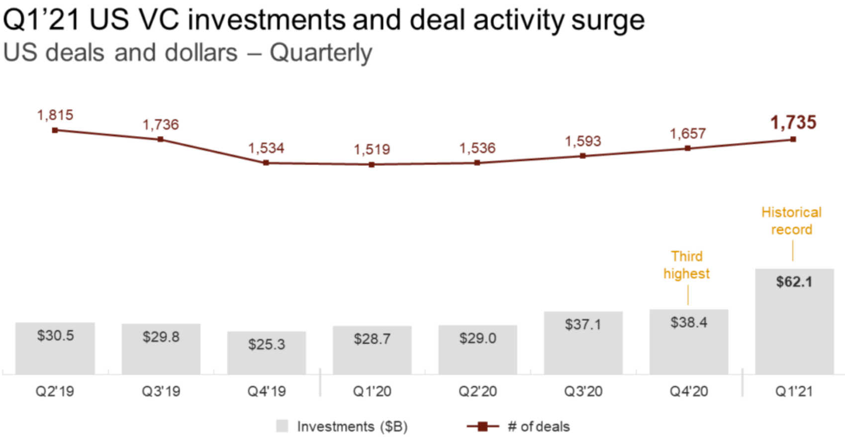 Inside the numbers: Mega-rounds drove last quarter's U.S. VC activity, accounting for 64% of total funding. The number of mega-rounds rose from 102 in Q4 2020 to 184 in Q1 2021.