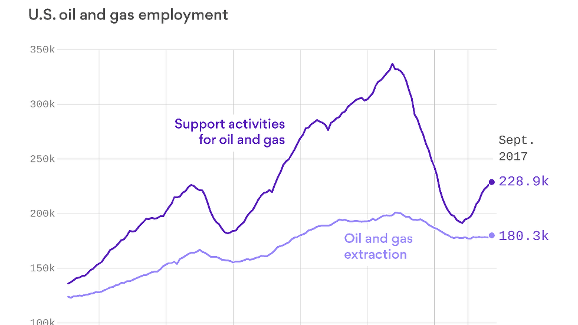 - Via Generate, our energy-focused newsletter: "Employment in one key part of the oil and gas industry — extraction and supporting activities — has not bounced back alongside U.S. production, which fell sharply in the 2015 price collapse but has been moving up again for a year and heading for record levels."