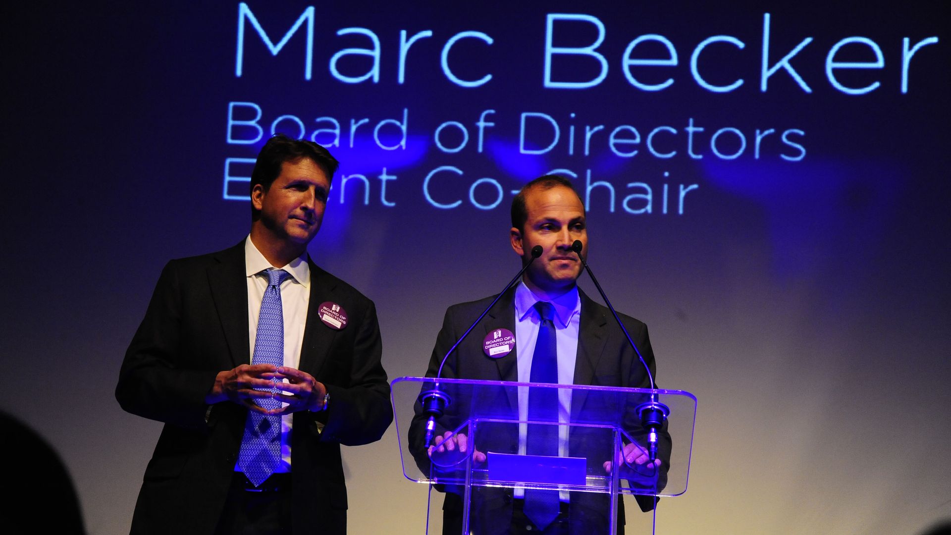 Marc Becker (right), at a 2016 event for the TEAK Fellowship, a program he chaired that helps students from low- income families. Photo: Paul Bruinooge/Patrick McMullan via Getty Images