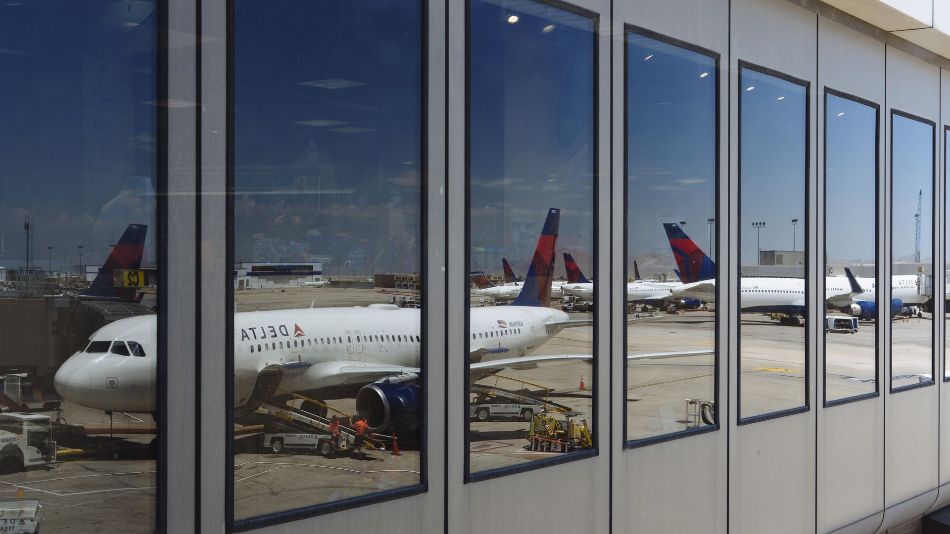 Delta Air Lines planes are reflected in terminal windows at Salt Lake City International Airport (SLC) on 2018. Photo: Angus Mordant/Bloomberg via Getty Images
