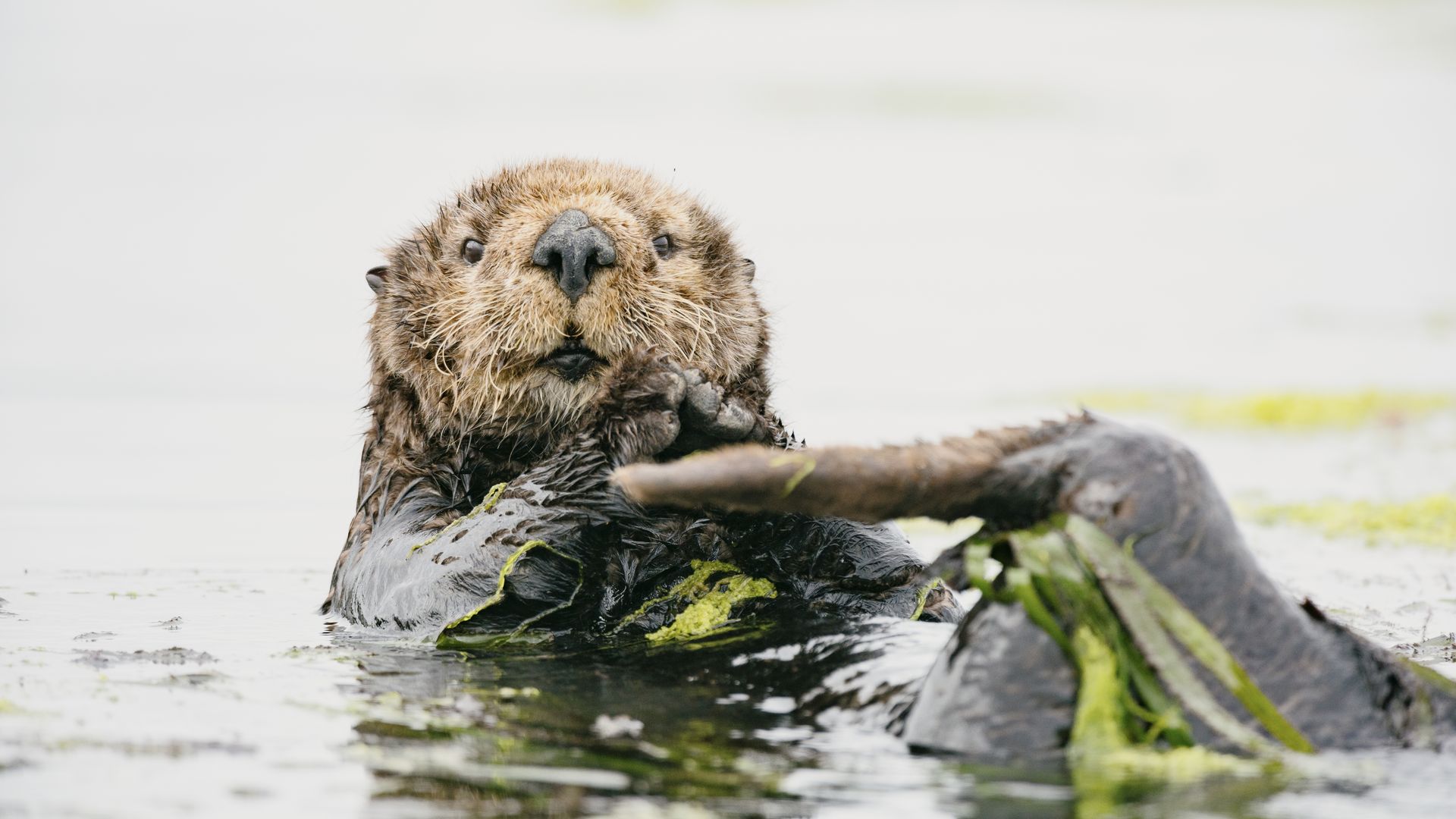 Sea otter resting in eelgrass with eelgrass draped over its hind foot. Photo: Kiliii Yüyan Photography