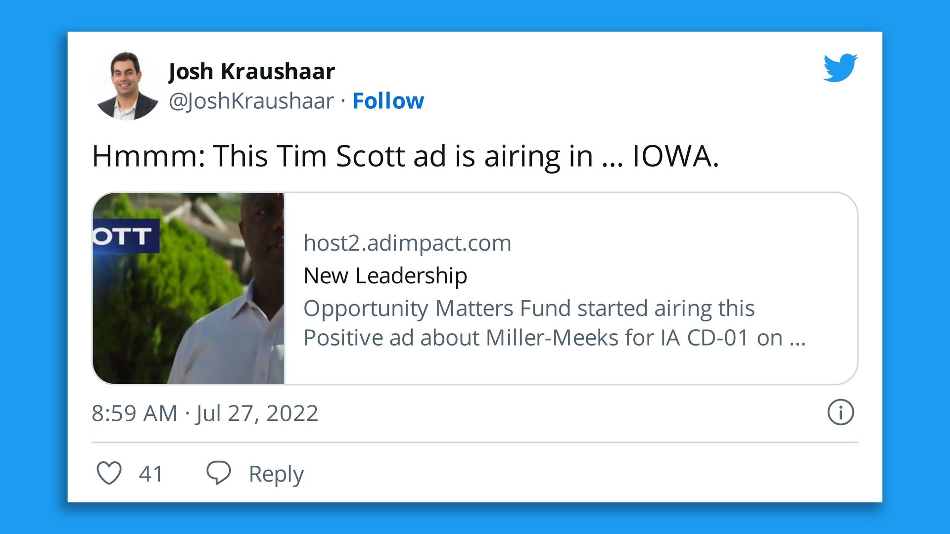 - Scott's political group, the Opportunity Matters Fund, went up with a pair of ads in Iowa promoting the candidacies of Reps. Marianne Miller-Meeks and Ashley Hinson.