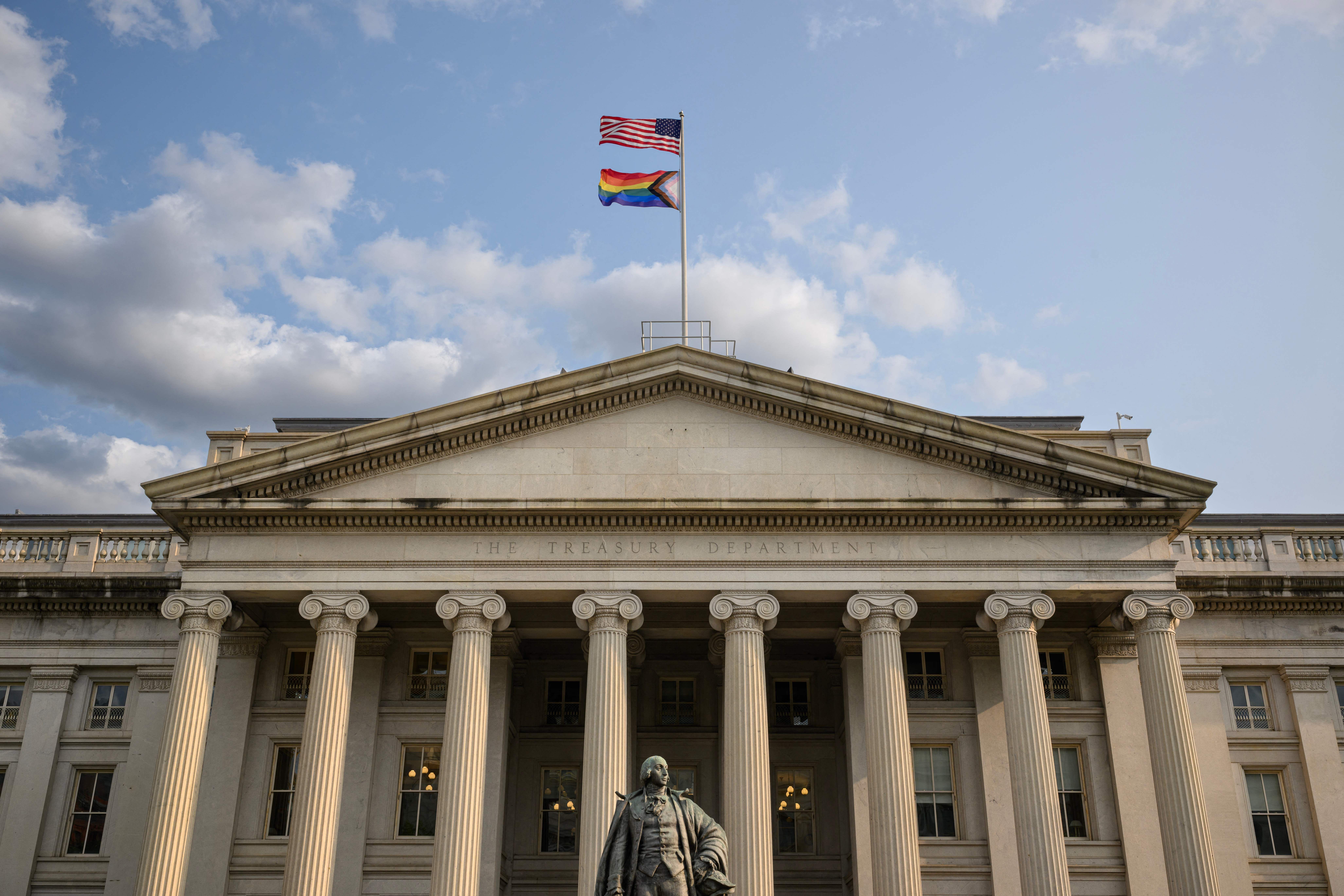 The Pride flag flies above the Treasury Department. It was raised by Treasury Secretary Janet Yellen to mark Pride month.