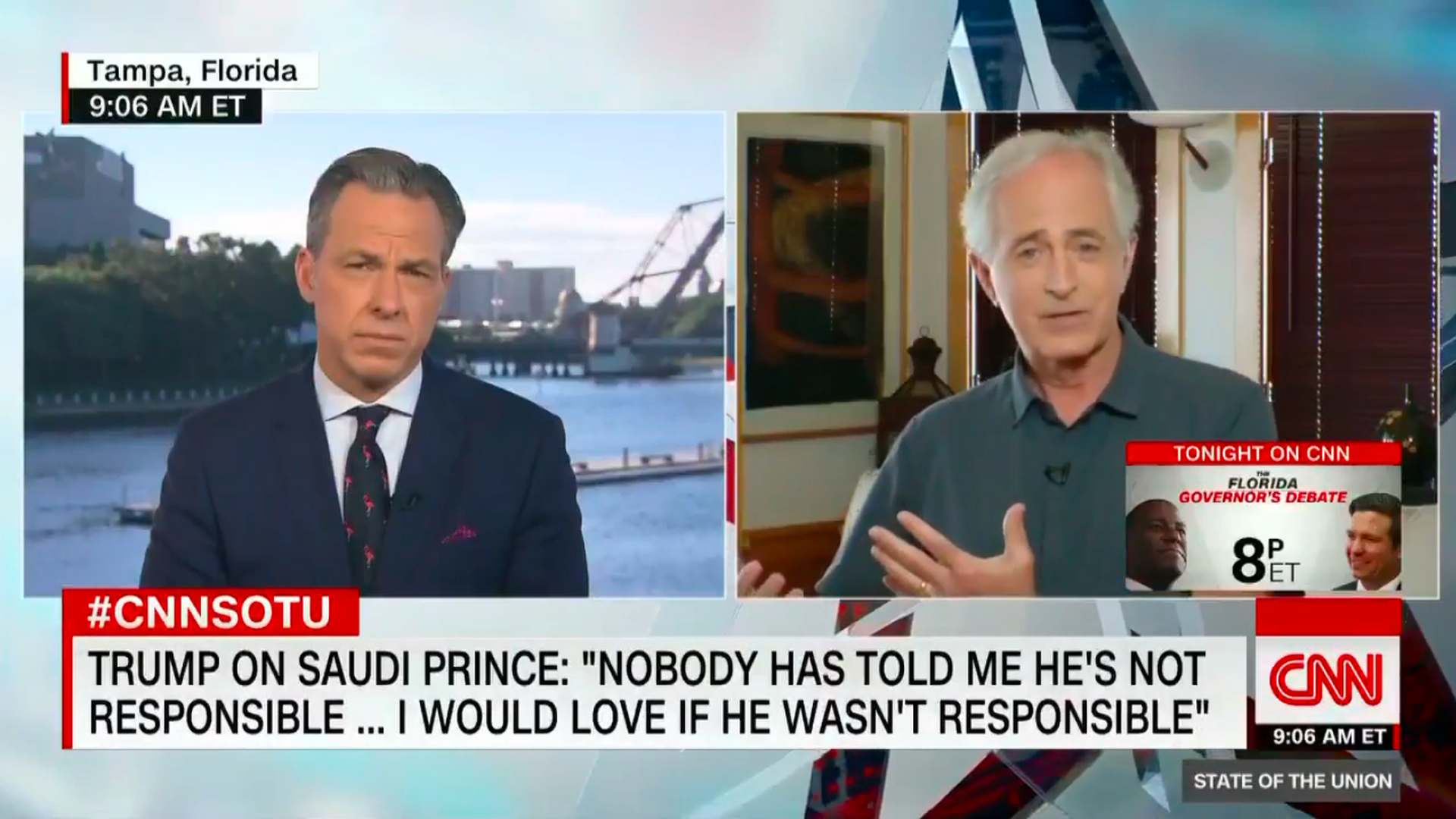 - Sen. Bob Corker discussed Crown Prince Mohammed bin Salman's potential involvement on CNN's "State of the Union": "If he's gone forth and murdered this journalist he's now crossed the line and there has to be a punishment and a price paid for that. And, again, I'm not rushing to judgment. Do I think he did it? Yes, I think he did it."