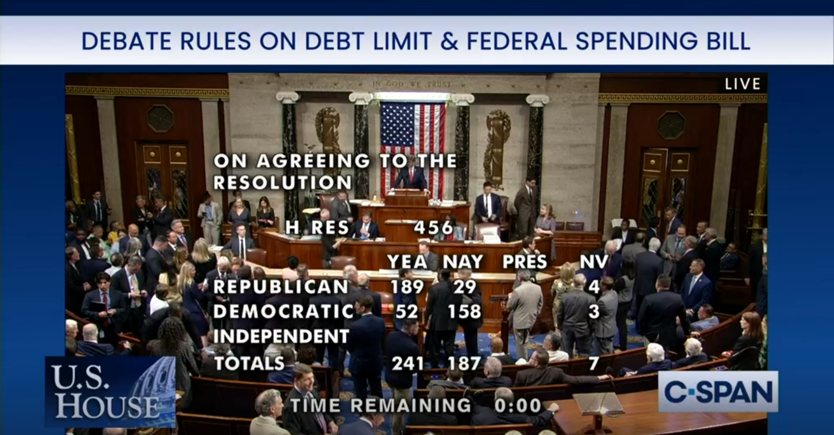 - The Democrats lingered in the chamber throughout the vote, waiting to see the Republican count — then voted "yes" en masse after Jeffries held up a green card.