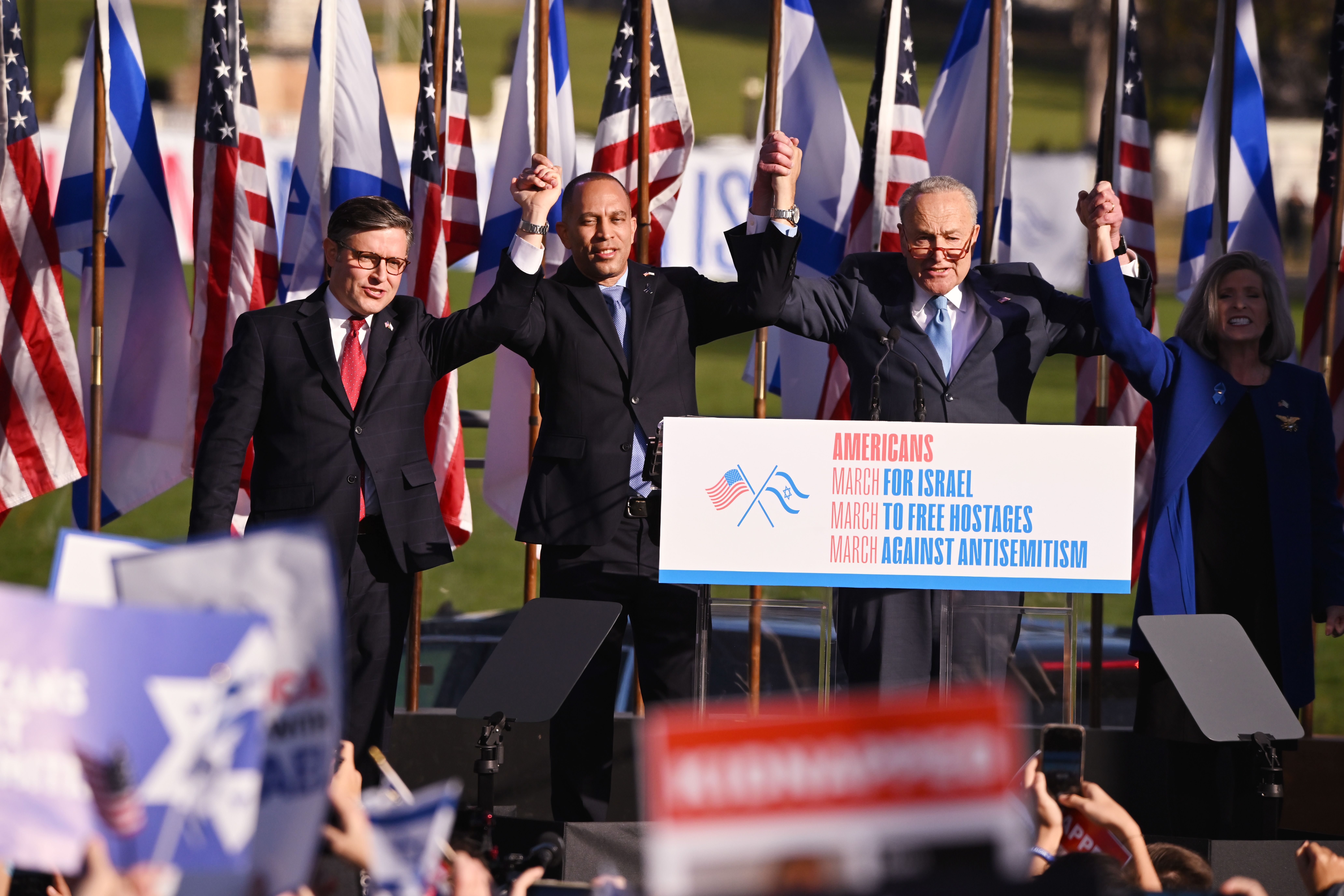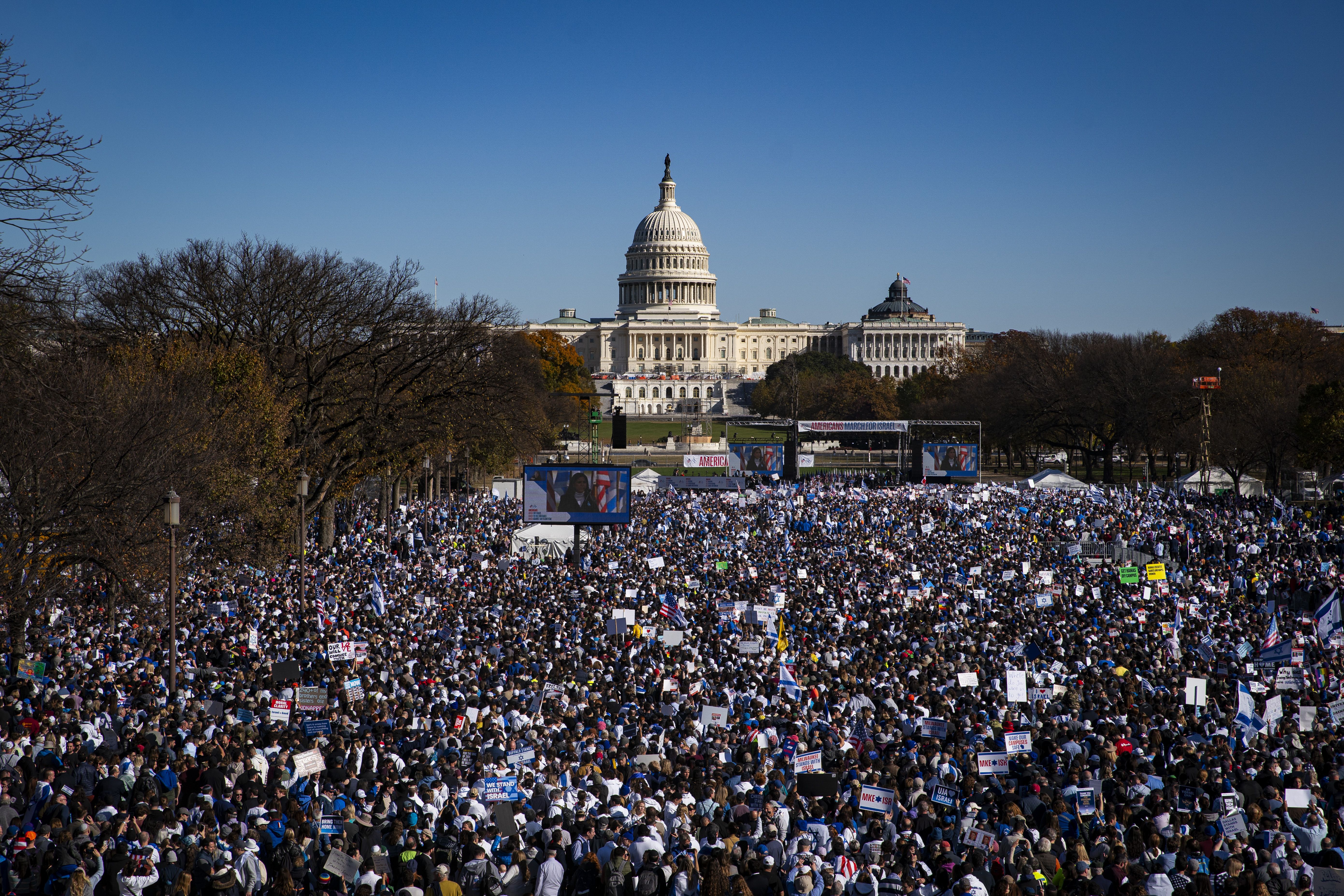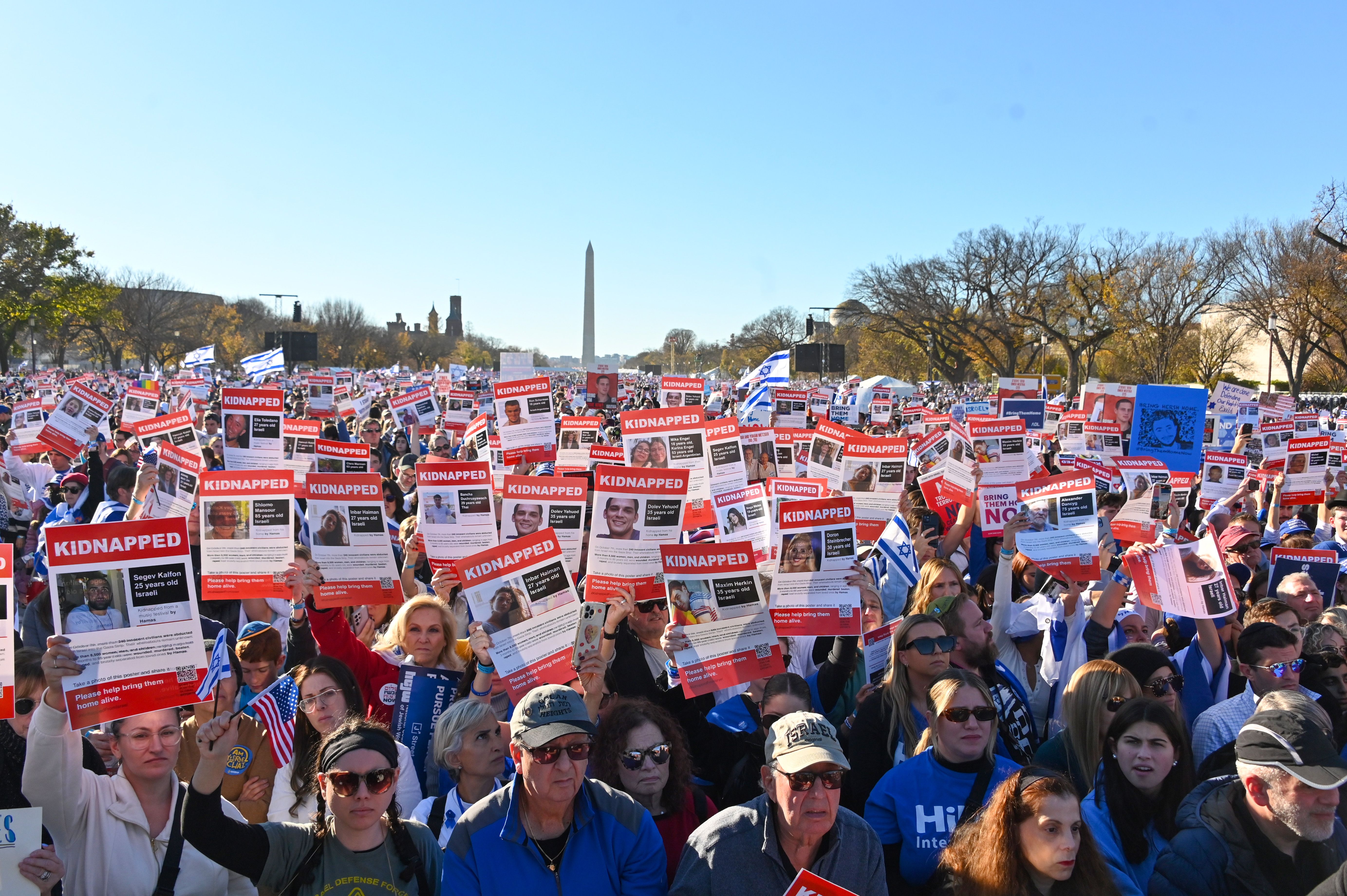 Tens of thousands of people flooded the National Mall today for a massive pro-Israel rally, where bipartisan congressional leaders rejected calls for a ceasefire and demanded the release of hostages kidnapped by Hamas.