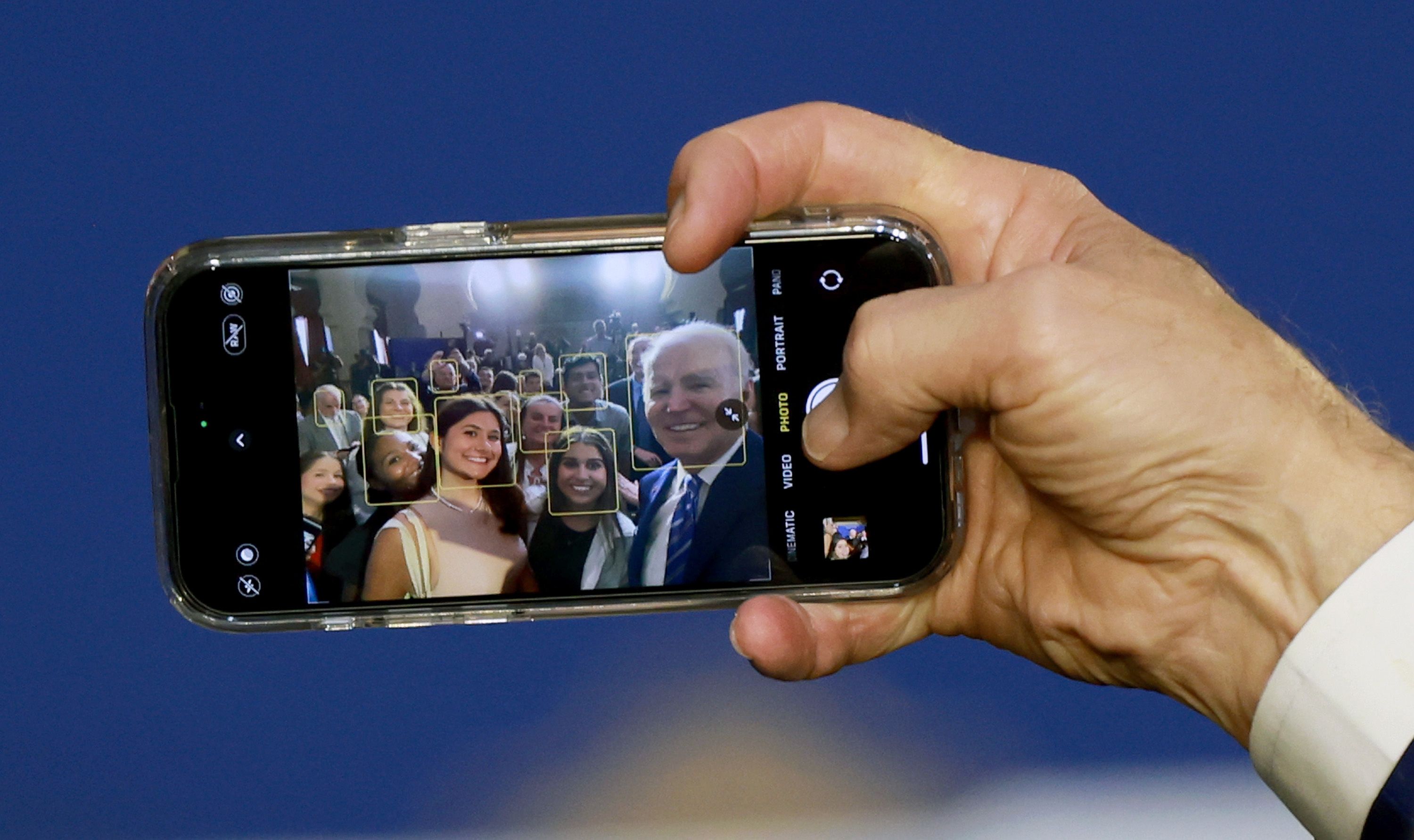President Biden takes a selfie at an event to discuss Social Security and Medicare held today at the University of Tampa.