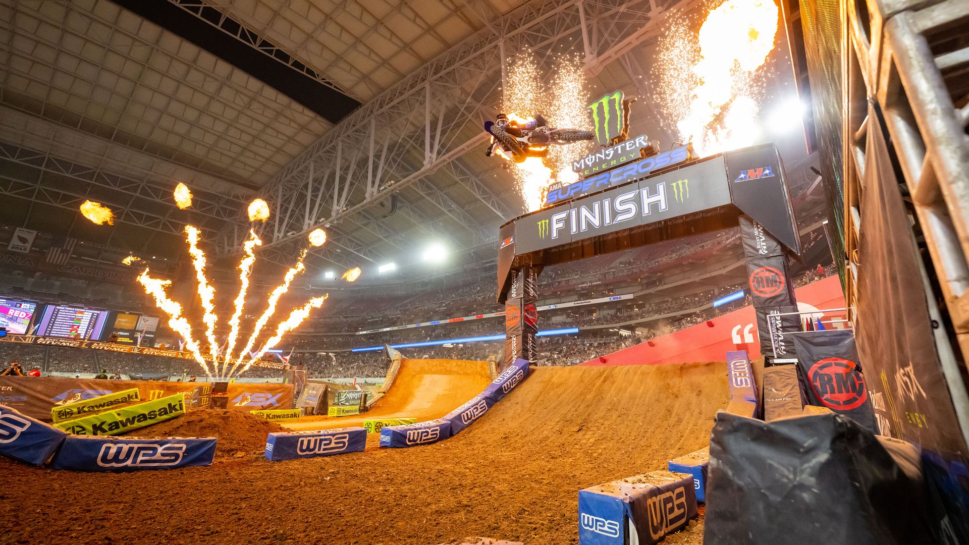 Eli Tomac goes airborne during his Supercross victory on Monday at State Farm Arena in Glendale, Arizona. Photo: Courtesy of Feld Motor Sports Inc.
