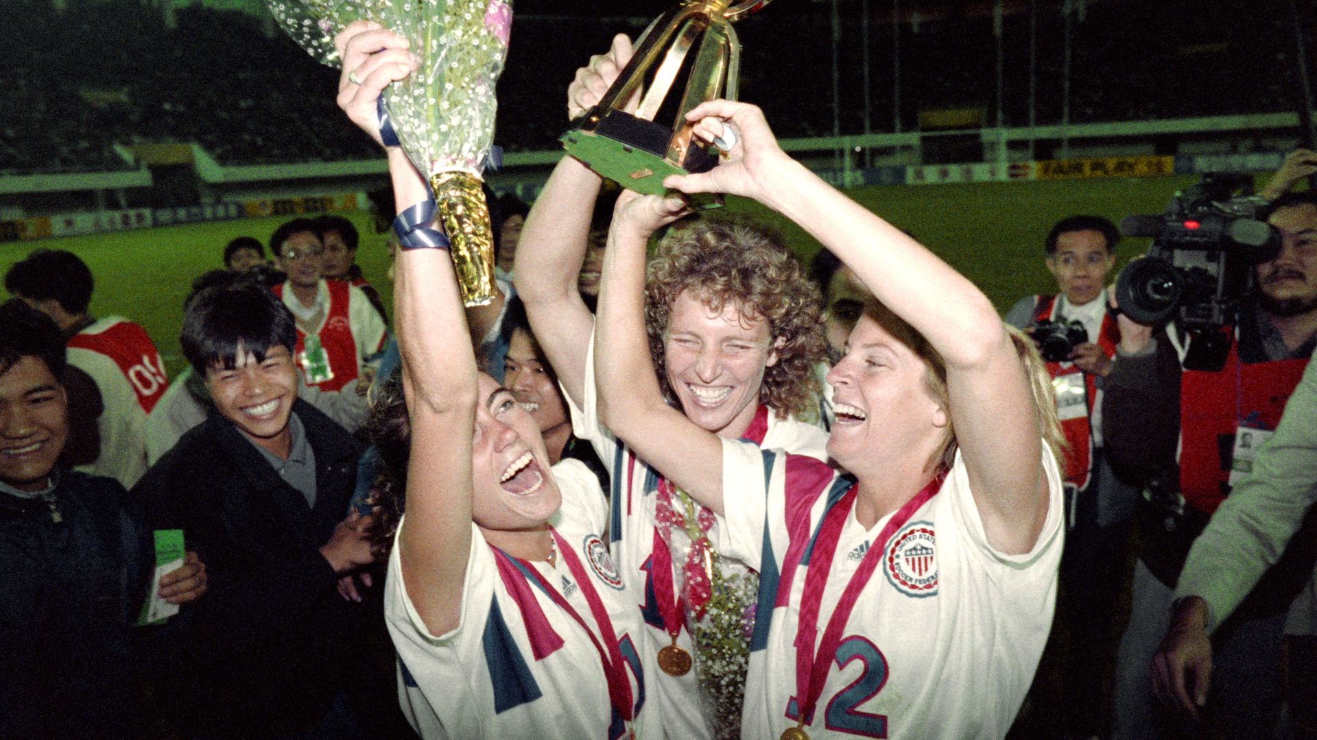 Julie Foudy (L), Michelle Akers-Stahl and Carin Jennings after winning the 1991 Women's World Cup. Photo: Tommy Cheng/AFP via Getty Images