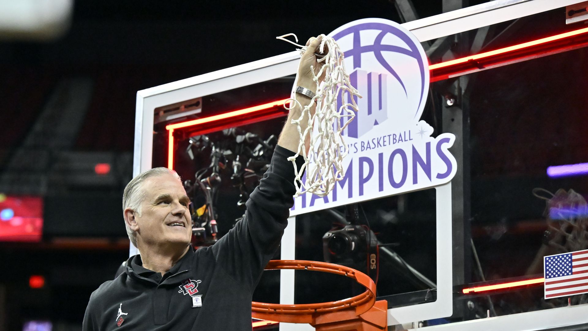 Head coach Brian Dutcher after winning the conference tournament this year. Photo: David Becker/Getty Images