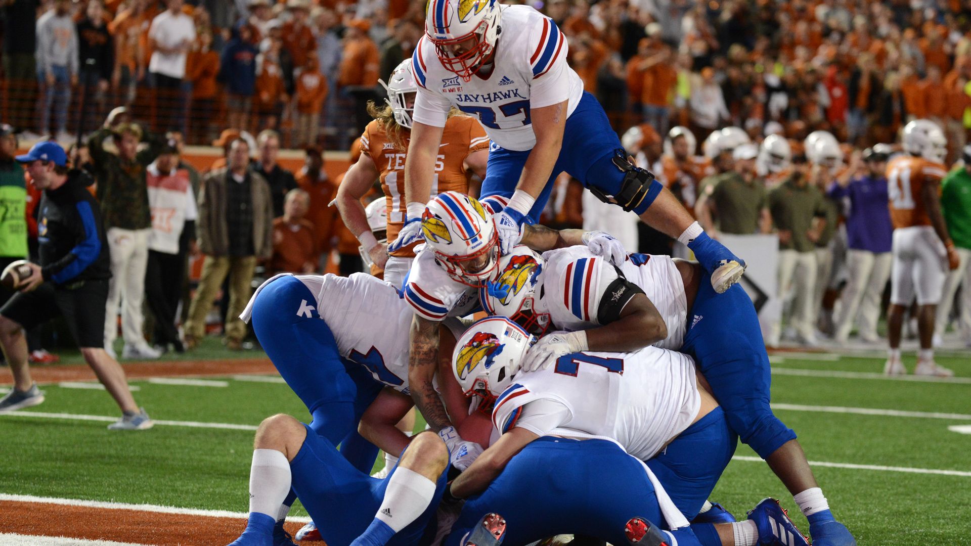 Kansas' upset win over Texas snapped a 56-game conference road losing streak, by far the longest active streak in FBS.