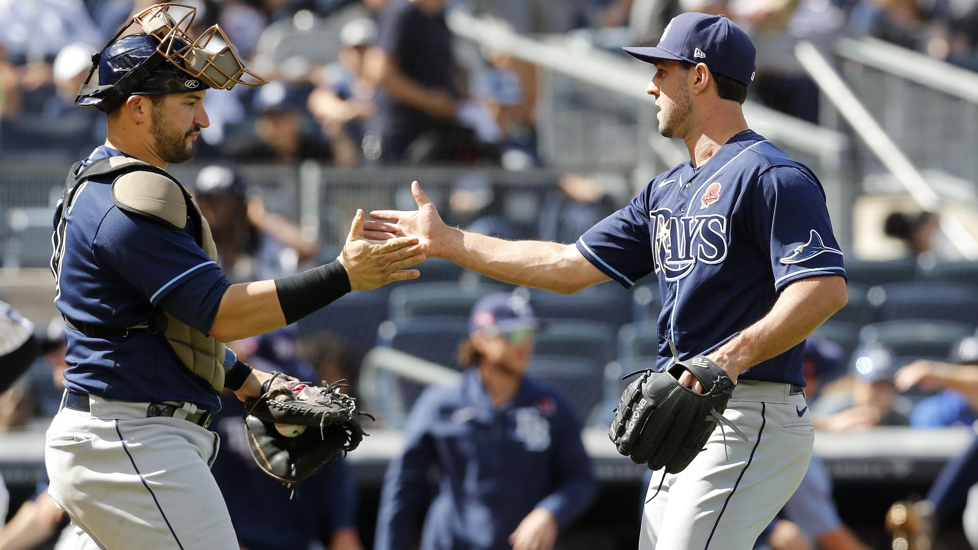 The Rays' J.P. Feyereisen and catcher Mike Zunino celebrate after defeating the Yankees yesterday. Photo: Jim McIsaac/Getty Images
