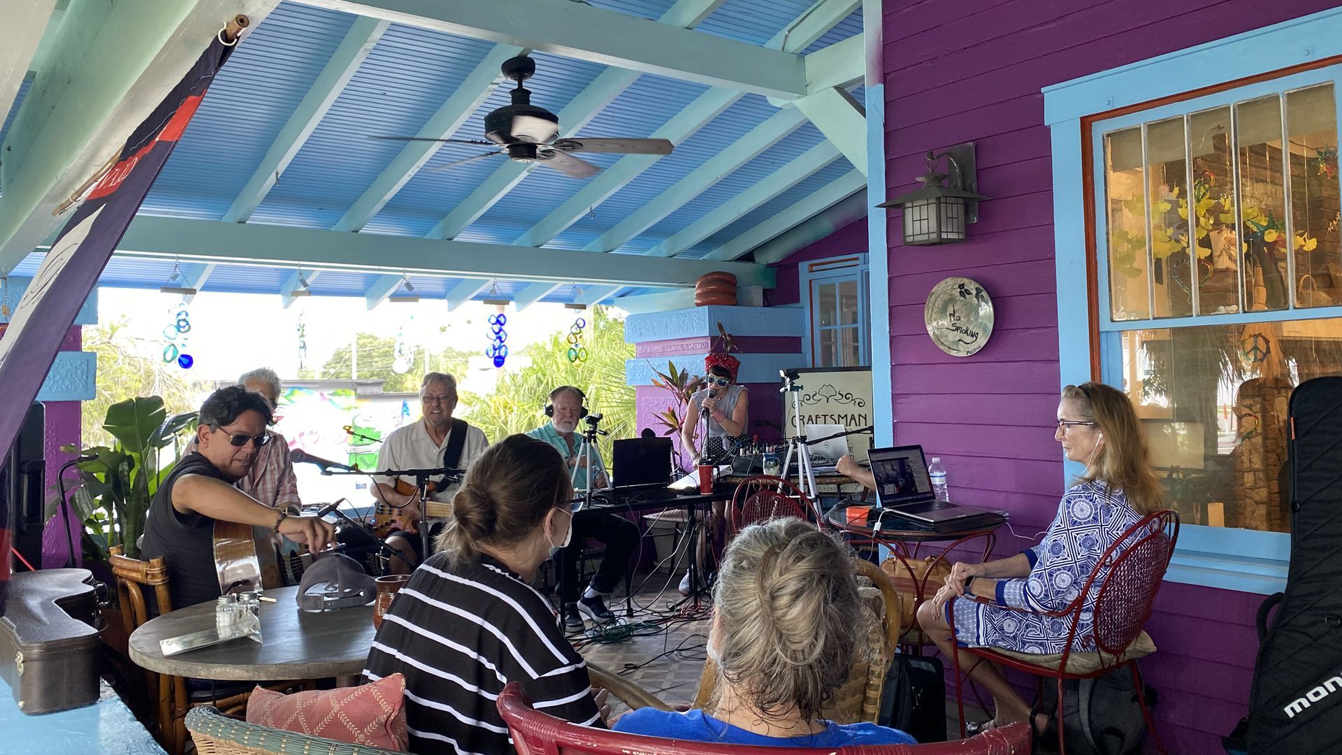 Hideaway Cafe owner John Kelly, black shirt, played Saturday on the Florida Folk Show from the porch of The Craftsmen House in St. Pete. Photo: Ben Montgomery/Axios