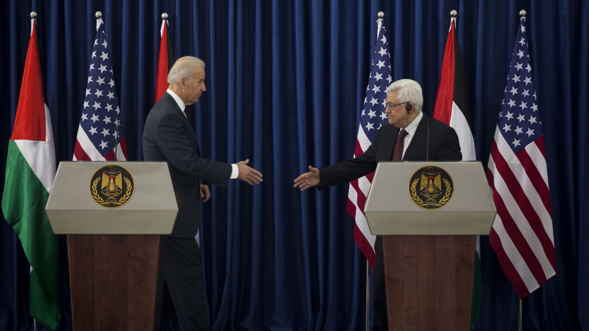 Biden with Palestinian President Mahmoud Abbas in 2010. Photo: Uriel Sinai/Getty Images
