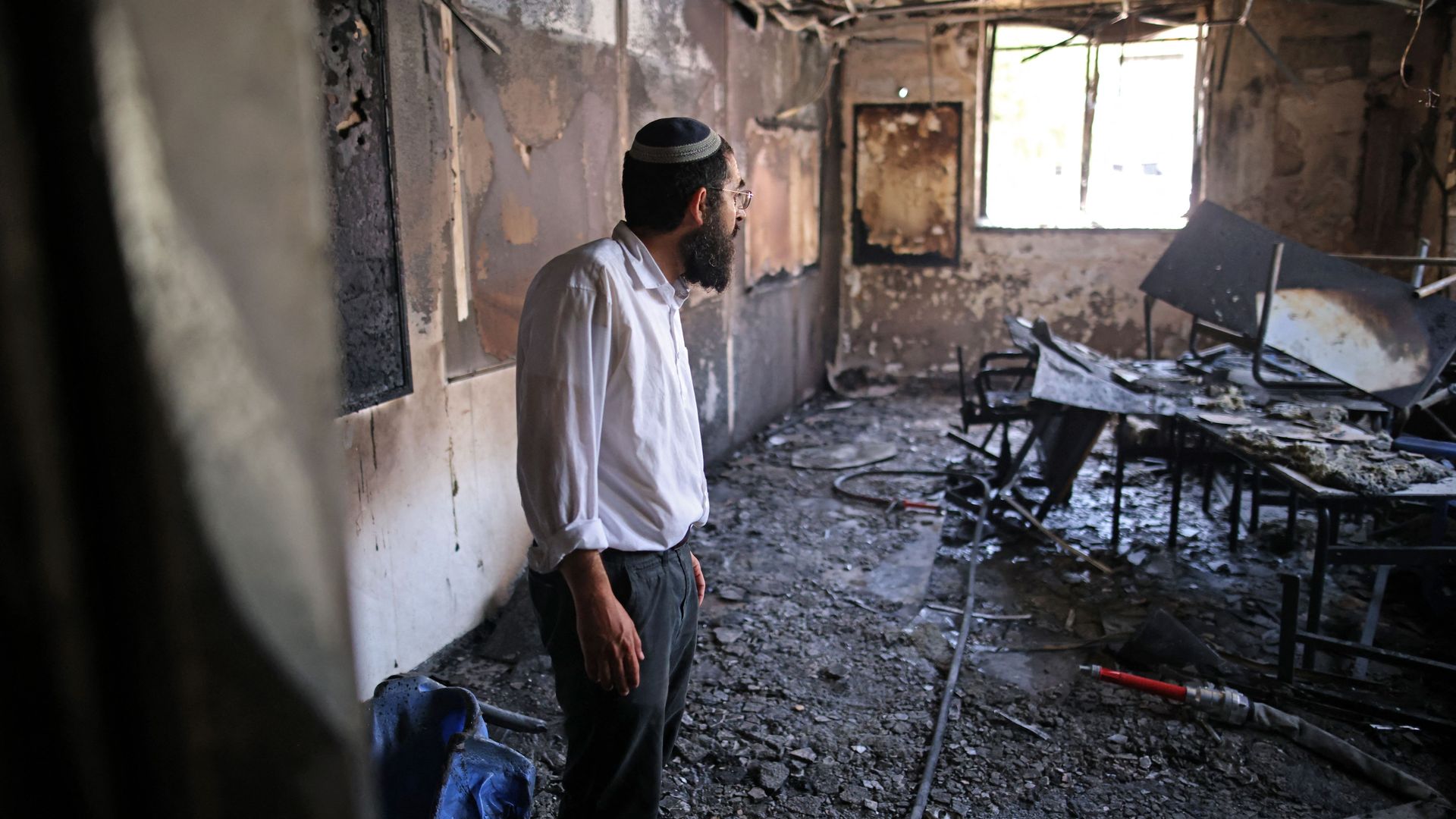 A rabbi inside a torched religious school in Lod. Photo: Ahmad Gharabli/AFP via Getty