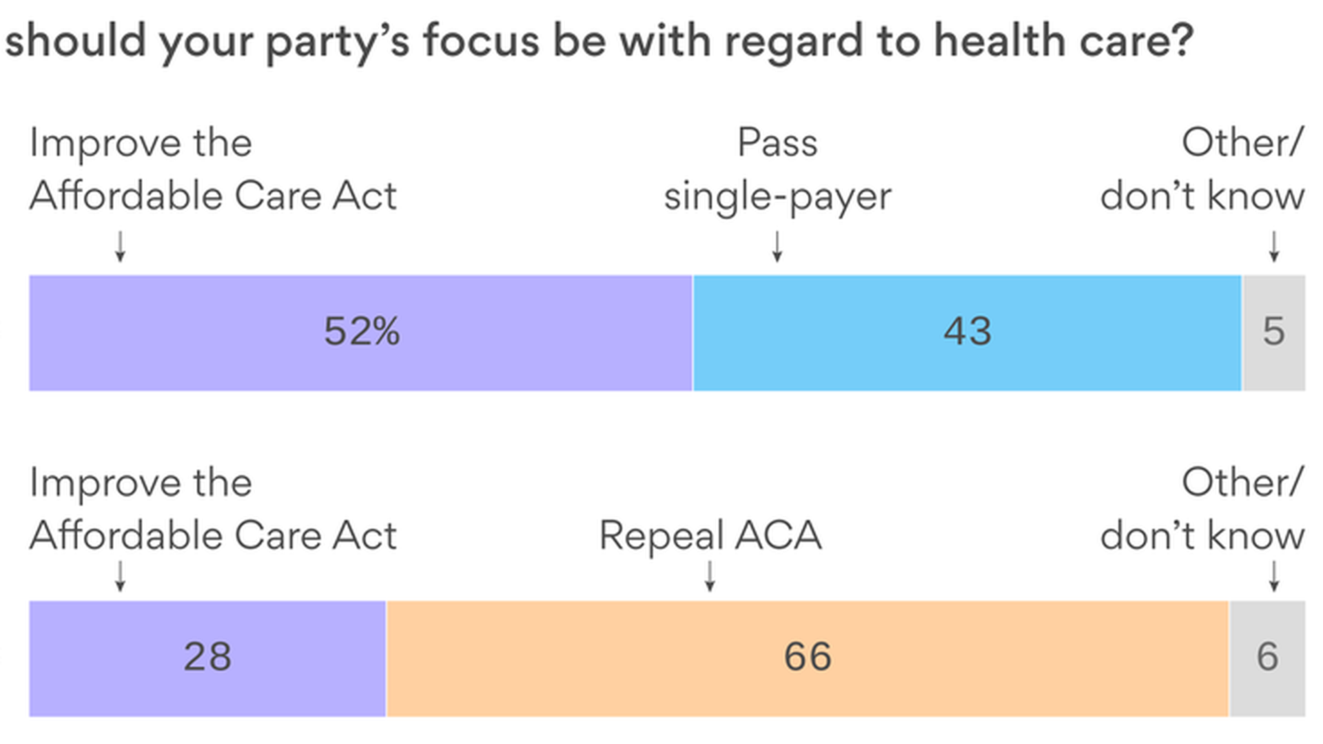 According to the latest Kaiser Family Foundation tracking poll, most Republican voters want Congress to focus on repealing the ACA rather than fixing it. That's not surprising. But the same poll found that only a small majority of Democrats — 52% — want Congress to focus on fixing the ACA, while 43% say moving on to "national health care" should be the higher priority.