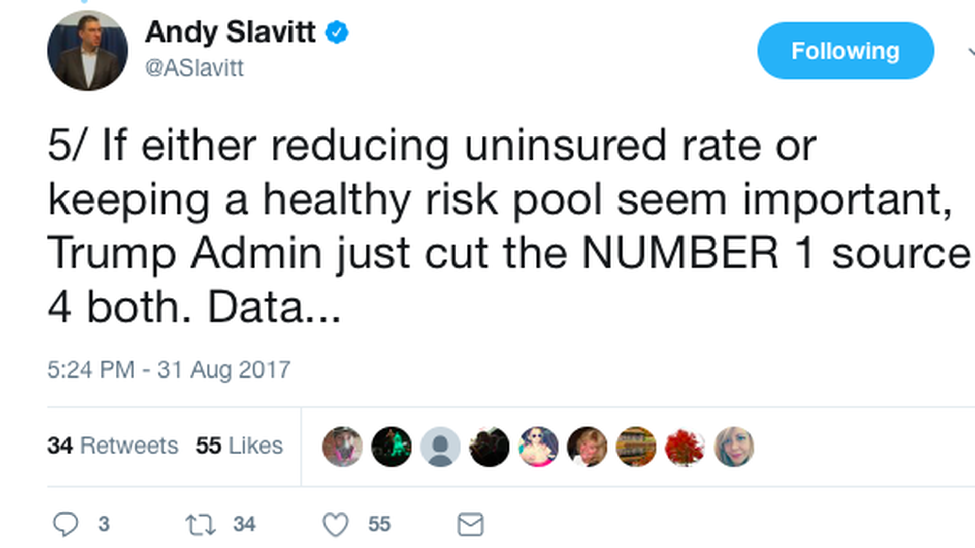 - Andy Slavitt, who ran the Centers for Medicare and Medicaid Services under former President Obama, says a 90% cut in ad spending means a "dramatic cut" to ACA enrollment next year — “which means a worsening risk pool, higher government outlays, less competition, and higher premiums paid by American families."