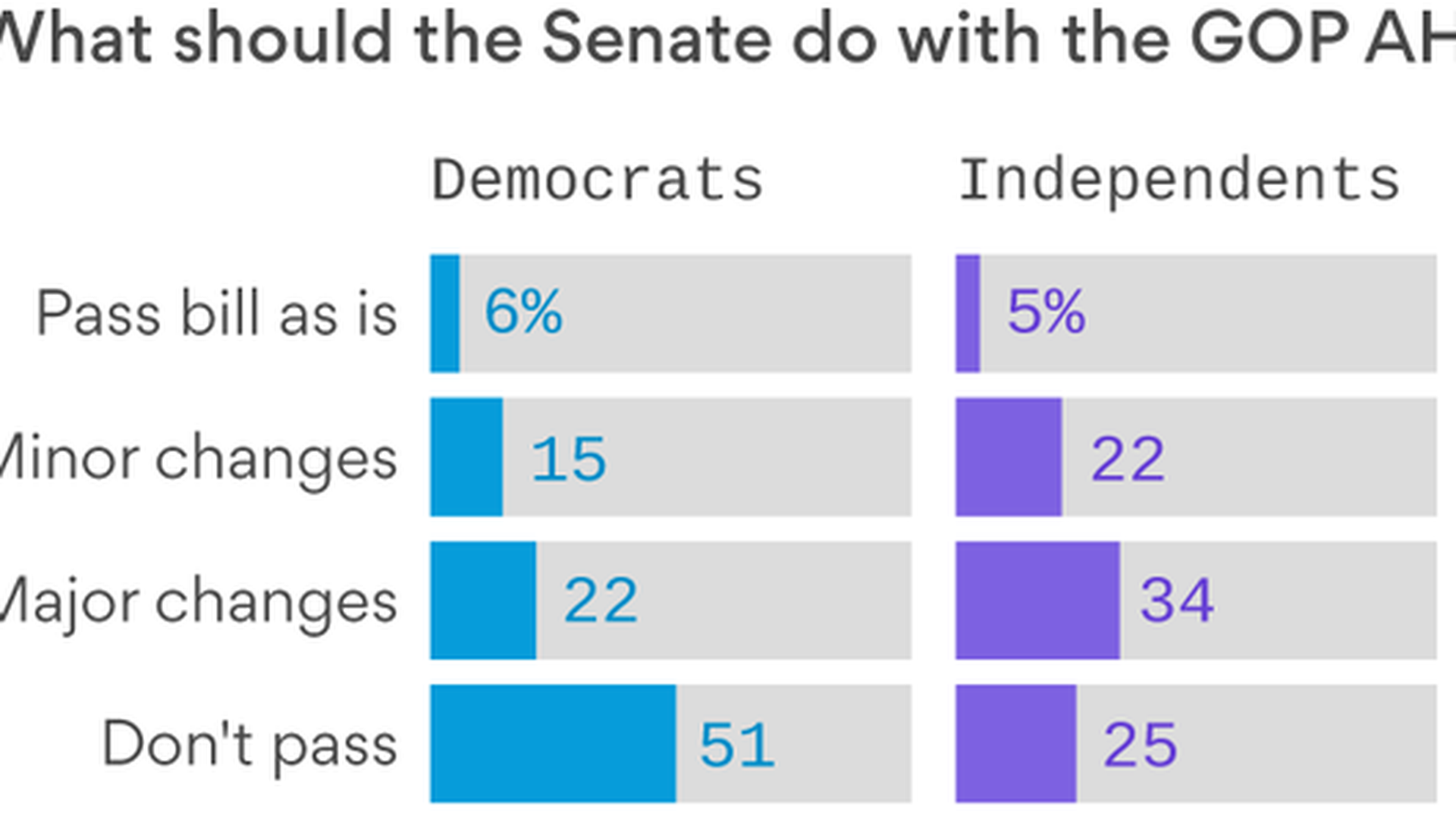 Partisanship is driving Americans' views of the GOP health care bill — and of the system it would replace. That's the gist of the Kaiser Family Foundation's latest tracking poll, which found stark partisan divides over…pretty much everything in health care. But there's a general consensus on one thing: Most Americans want the Senate to rewrite the House bill.
