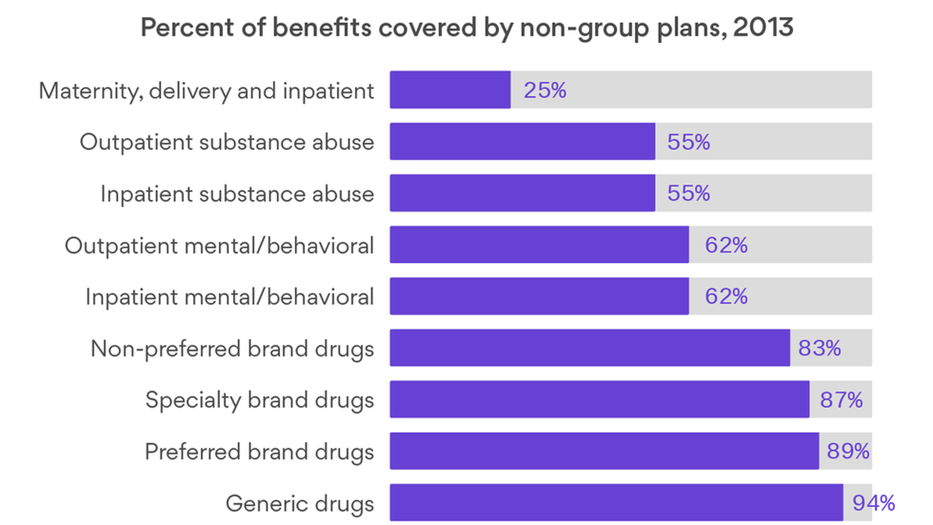 Kaiser looked at more than 8,000 plans, from all 50 states, that were on the market before the ACA's benefit mandates took effect, to see how widely they were already covering each of the law's essential benefits. Check out the graphic and you can see the results — only 25% of plans were covering maternity benefits.