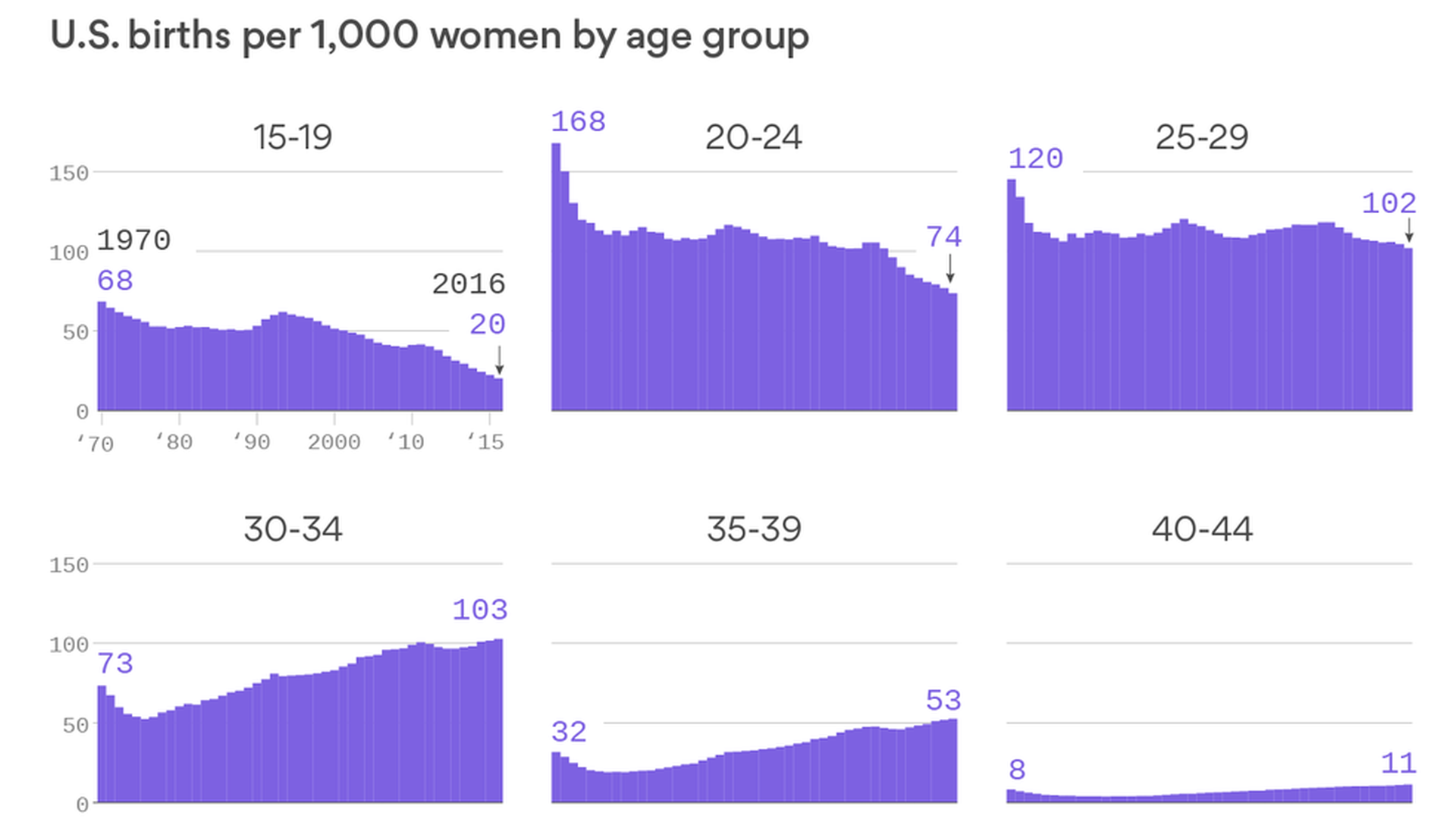 Why it matters: The CDC did not say why the birth rate is declining. But research and surveys have shown several reasons, including wider availability of birth control, personal economic instability from student loans or other debt, women focused on launching a career before starting a family, and a growing acceptance that not everyone wants to have children.