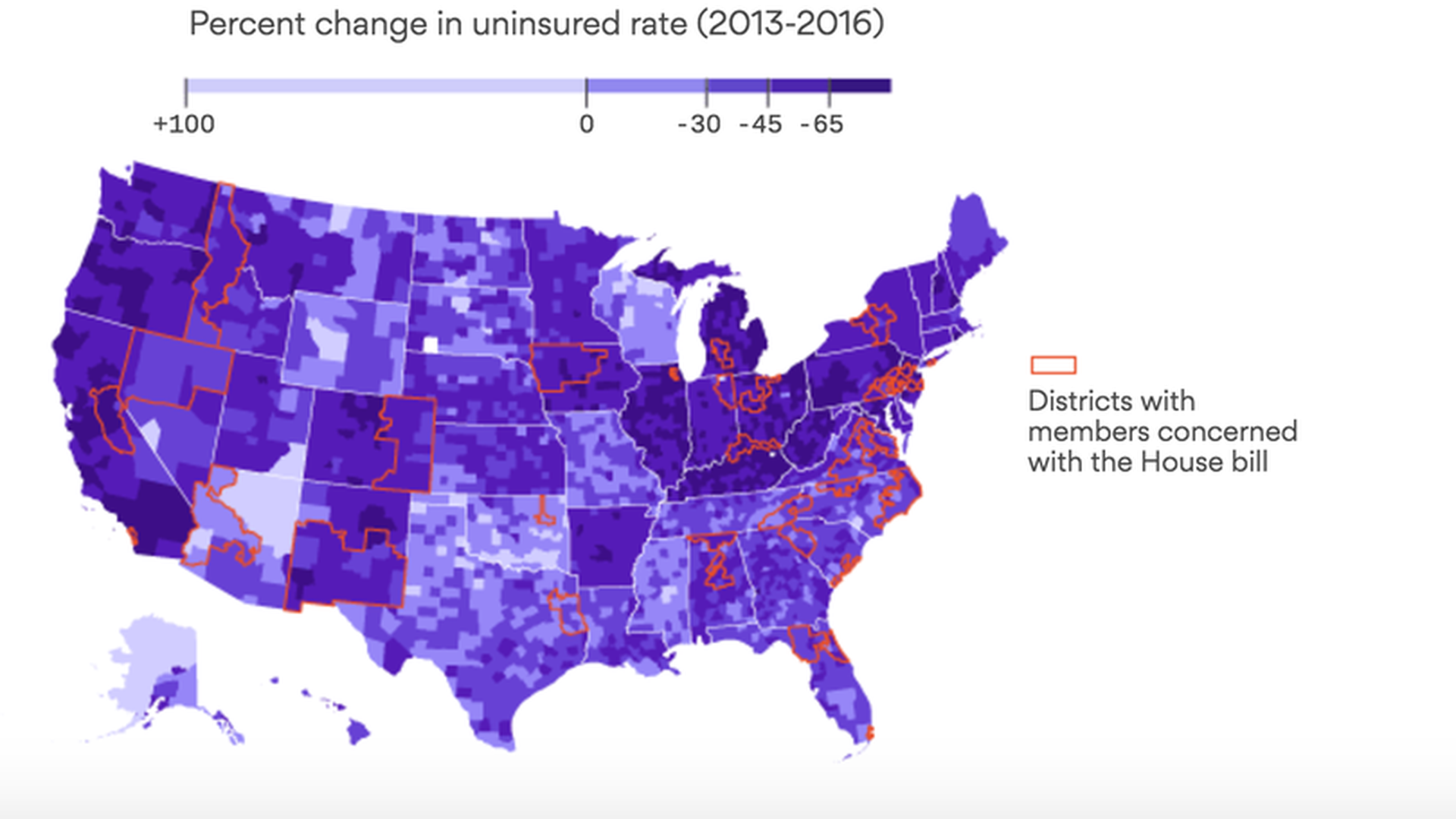 Dozens of Republicans in both the House and the Senate have publicly said they either oppose or are unsure about the House health care bill championed by Speaker Ryan. While some of these members are hardline conservatives who say the bill is just Obamacare-lite, others represent states and districts that have seen the largest decreases in the uninsured rate under Obamacare.