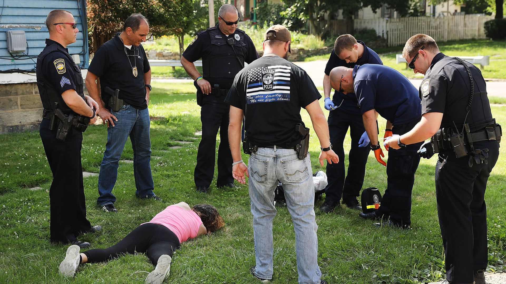 Police and medical workers treat a woman who overdosed on heroin. Photo: Spencer Platt/Getty Images