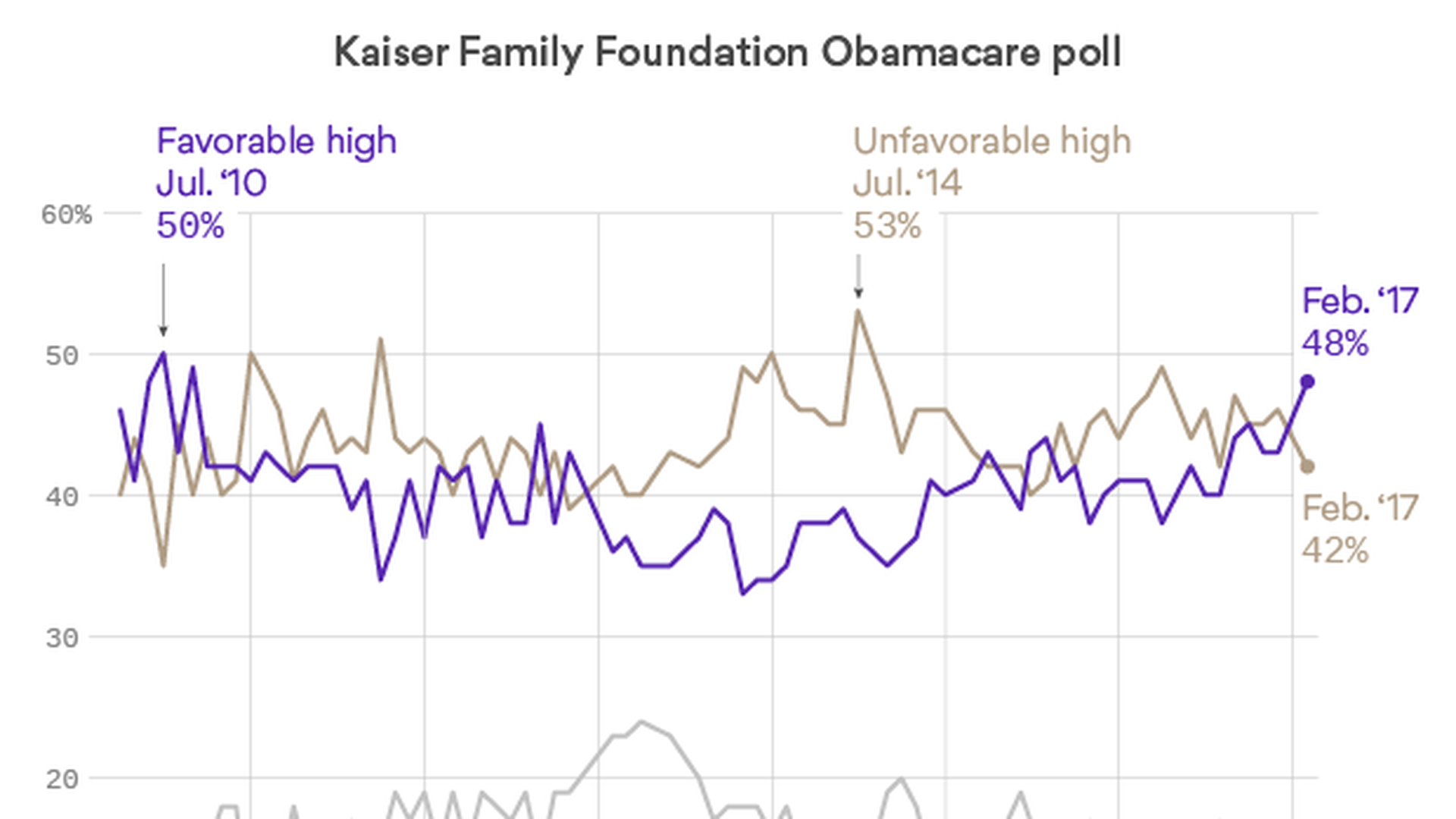 The Kaiser Family Foundation is out today with the latest evidence that the repeal threat is making Obamacare more popular: Its monthly tracking poll shows the highest favorable rating the program has had since 2010, the year President Barack Obama signed it into law.