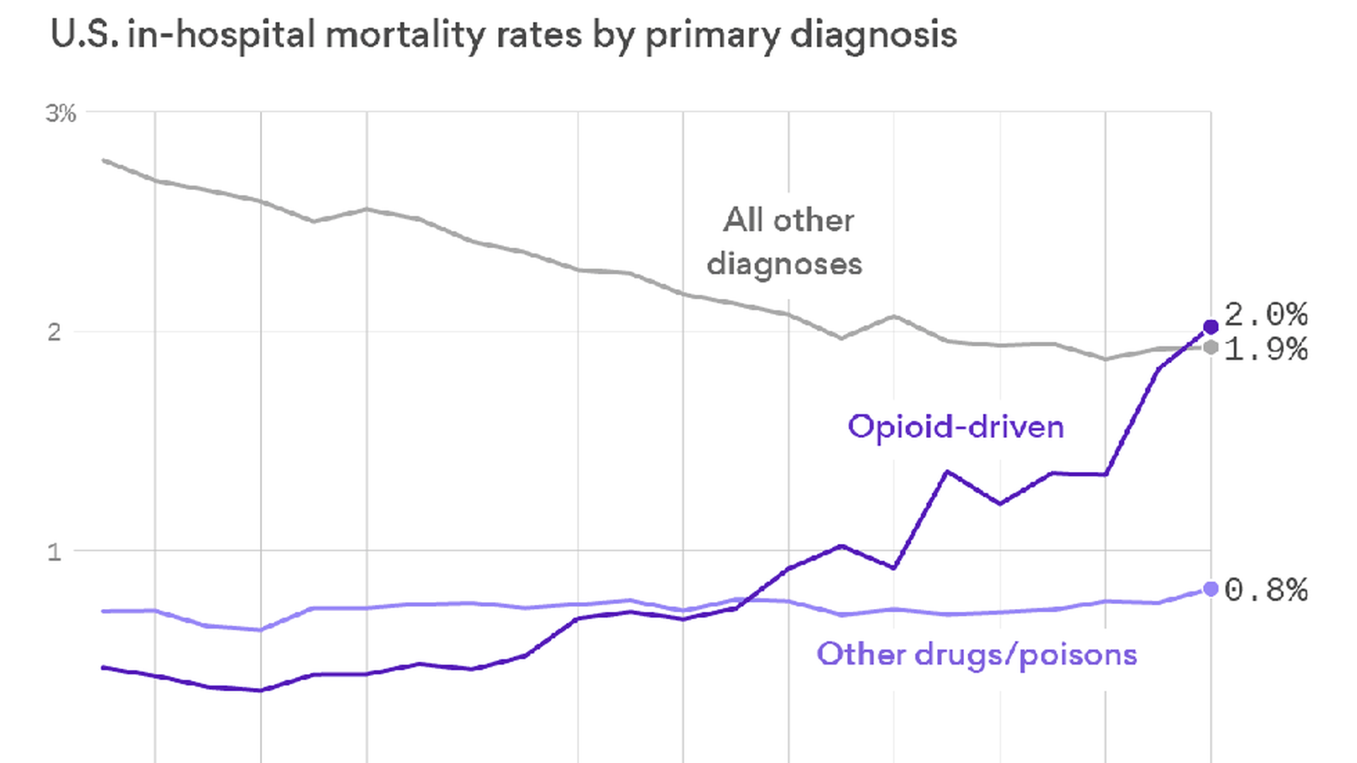 What's happening: A study published in the new issue of Health Affairs finds that mortality rates for opioid patients quadrupled between 2000 and 2014. The hospital mortality rate for other drugs stayed about the same, while survival rates for all other hospitalizations improved over the same period.