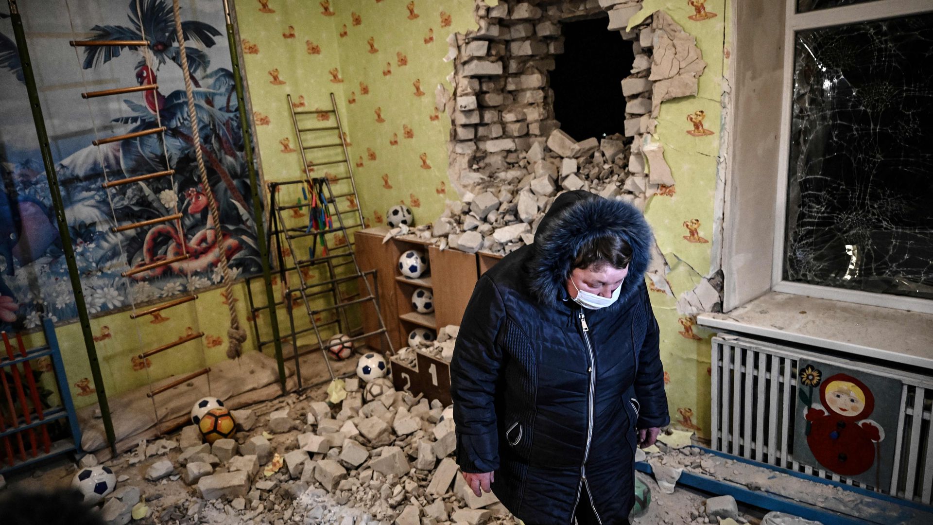 The aftermath of the reported shelling of a kindergarten in Stanytsia Luhanska. Photo: Aris Messinis/AFP via Getty