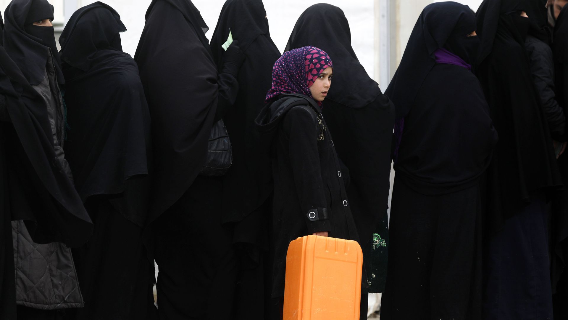 Syrian women queue to collect aid at the al-Hol refugee camp in northeastern Syria as winter weather engulfs the region. Photo: Delil Souleiman/AFP/Getty