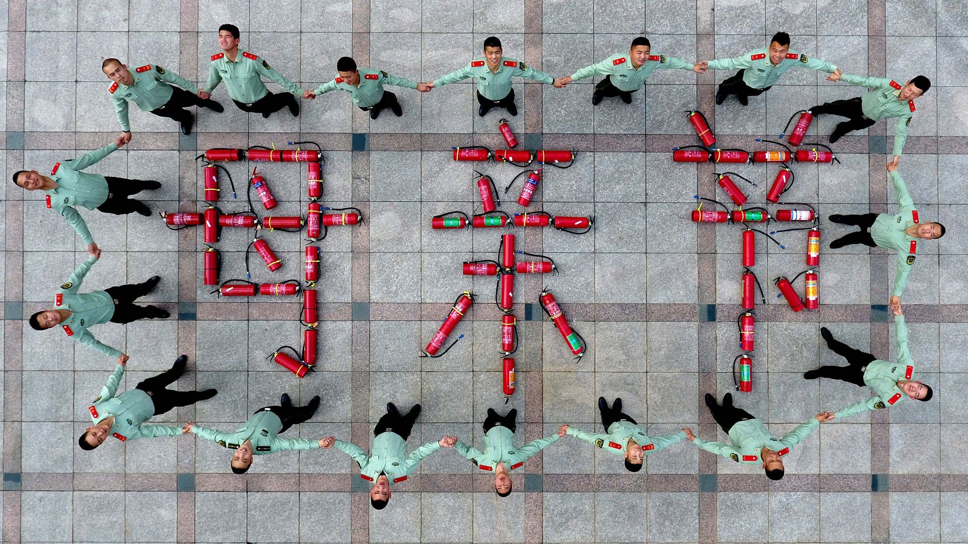 Soldiers from a fire brigade arrange fire extinguishers to form 'Mother's Day' in Shengzhou. Photo: VCG/VCG via Getty