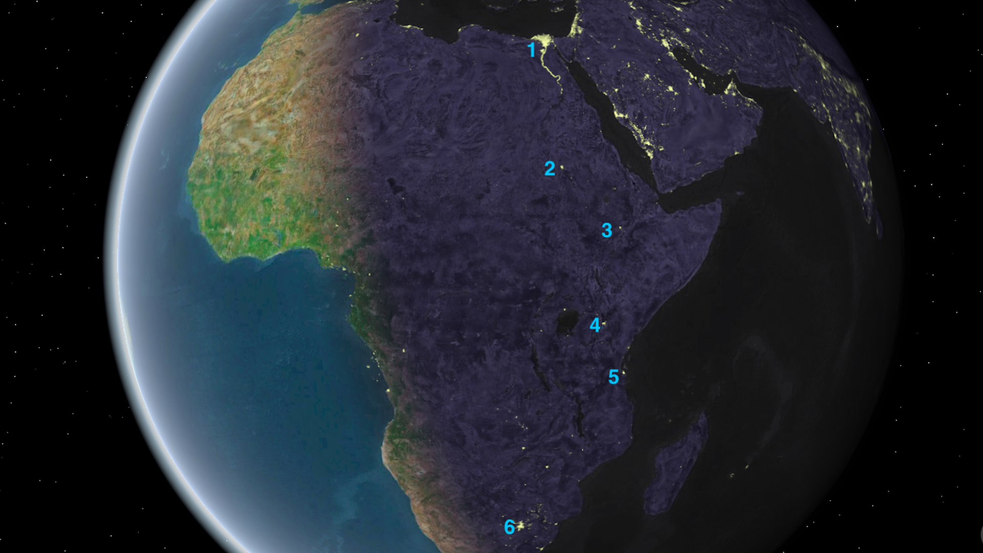 Answers: Cairo (1), Khartoum (2), Addis Ababa (3), Nairobi (4), Dar es Salaam (5), Johannesburg (6).