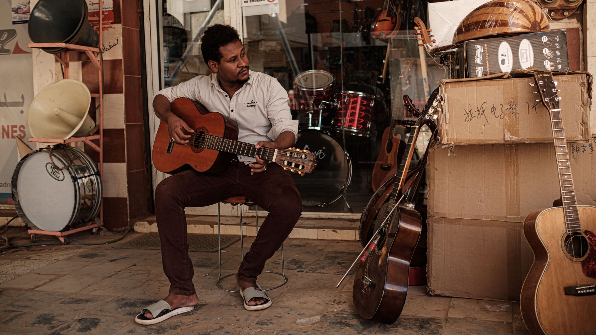 Strumming a guitar in Khartoum. Photo: Yasuyoshi Chiba/AFP via Getty