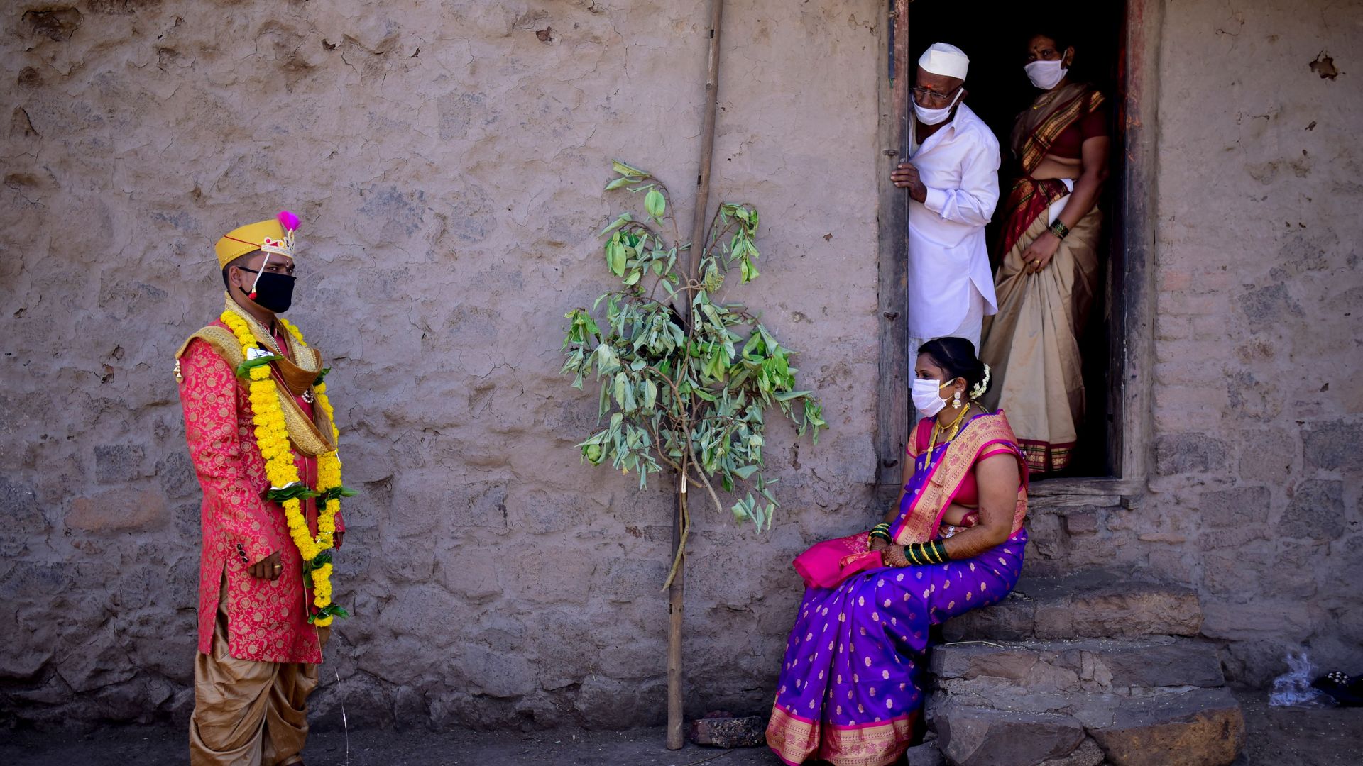 A groom and his socially distanced wife in a village in Maharashtra, India. Photo: Sanket Wankhade/AFP via Getty Images
