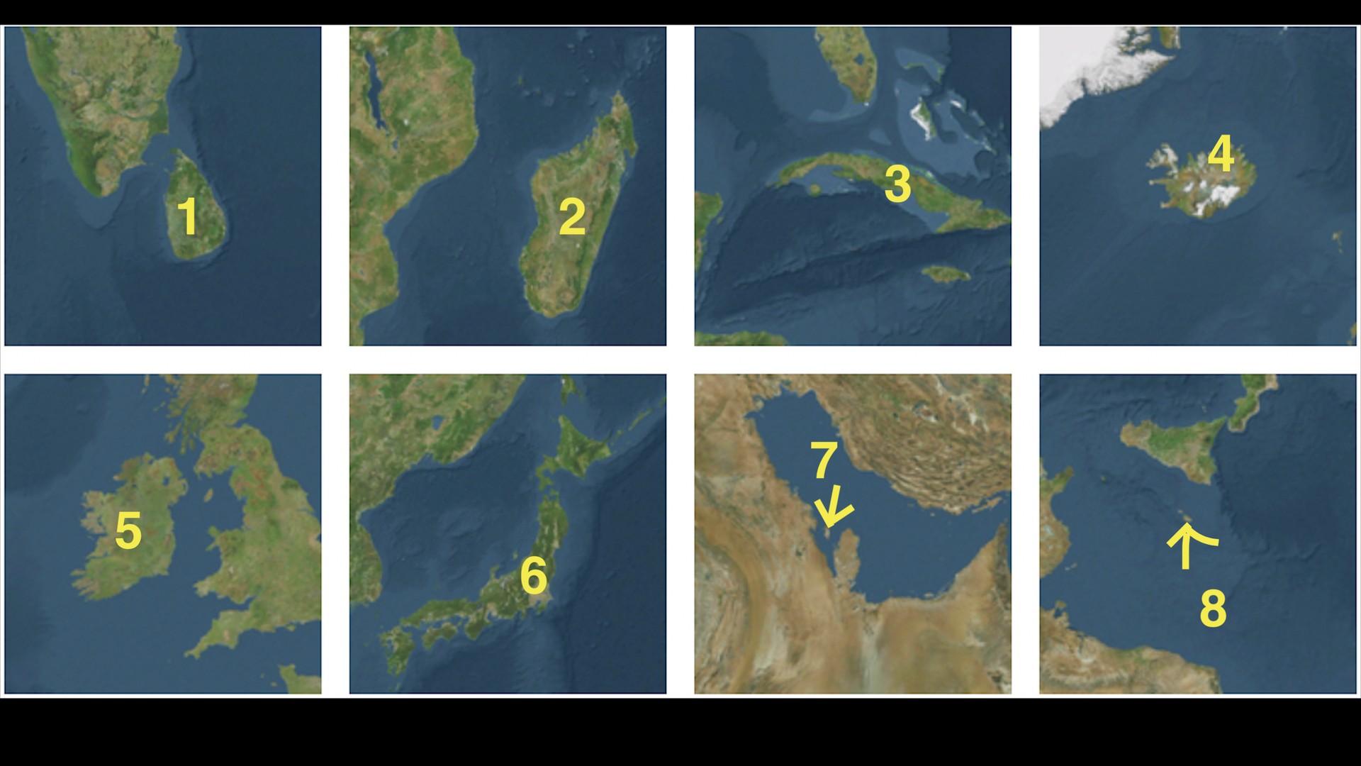 Answers: 1. Sri Lanka; 2. Madagascar; 3. Cuba; 4. Iceland; 5. Ireland; 6. Japan; 7. Bahrain; 8. Malta