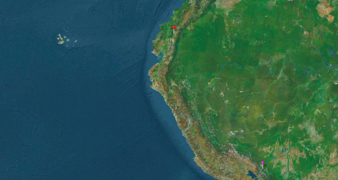 Answer: We're in the Andes visiting La Paz, Bolivia (purple pin), Quito, Ecuador (red pin), Bogotá, Colombia (bonus I) and the Galápagos Islands (bonus II).