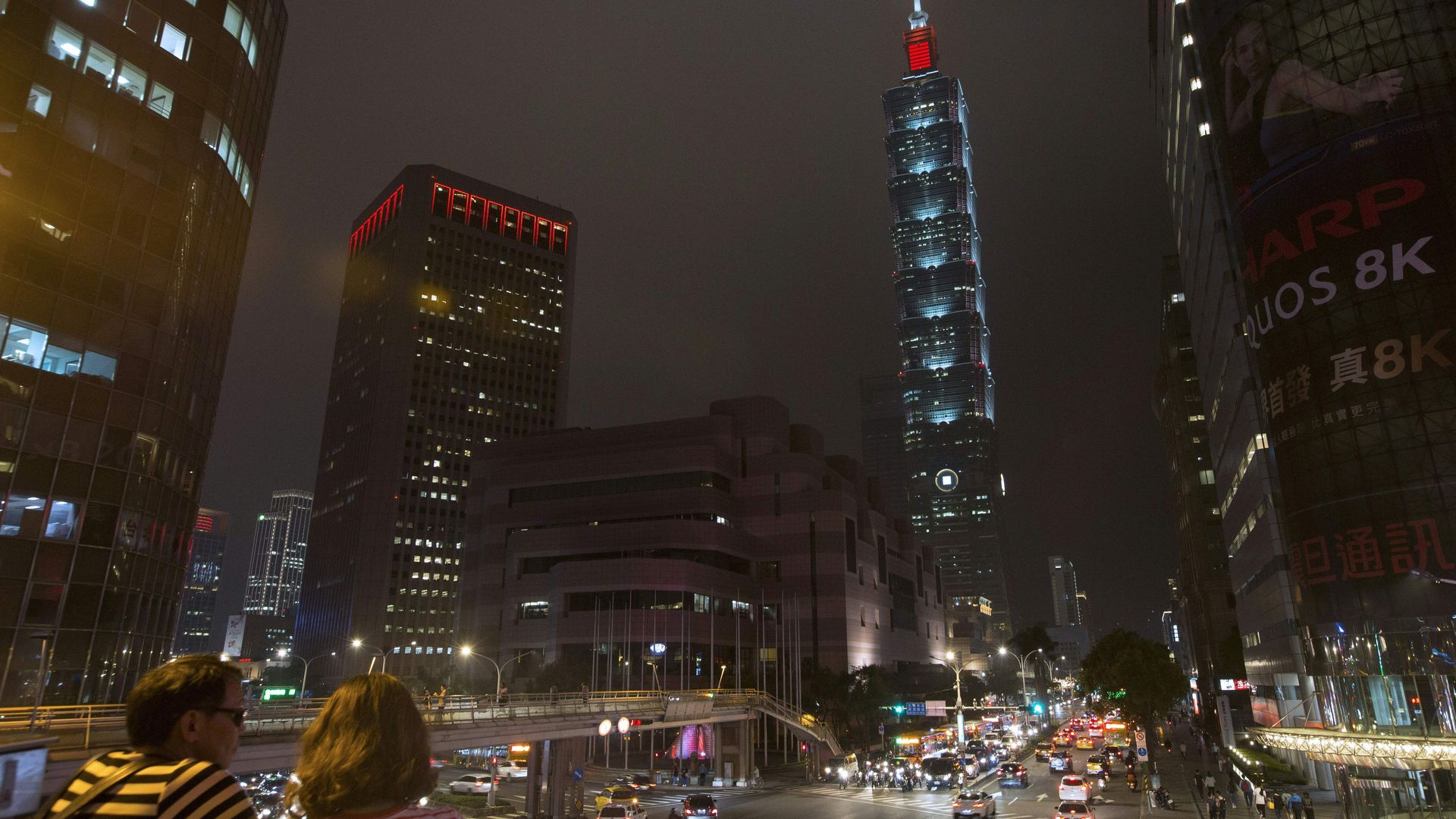 A couple looks out from an overpass in Taipei. Photo: Ashley Pon/AFP/Getty Images