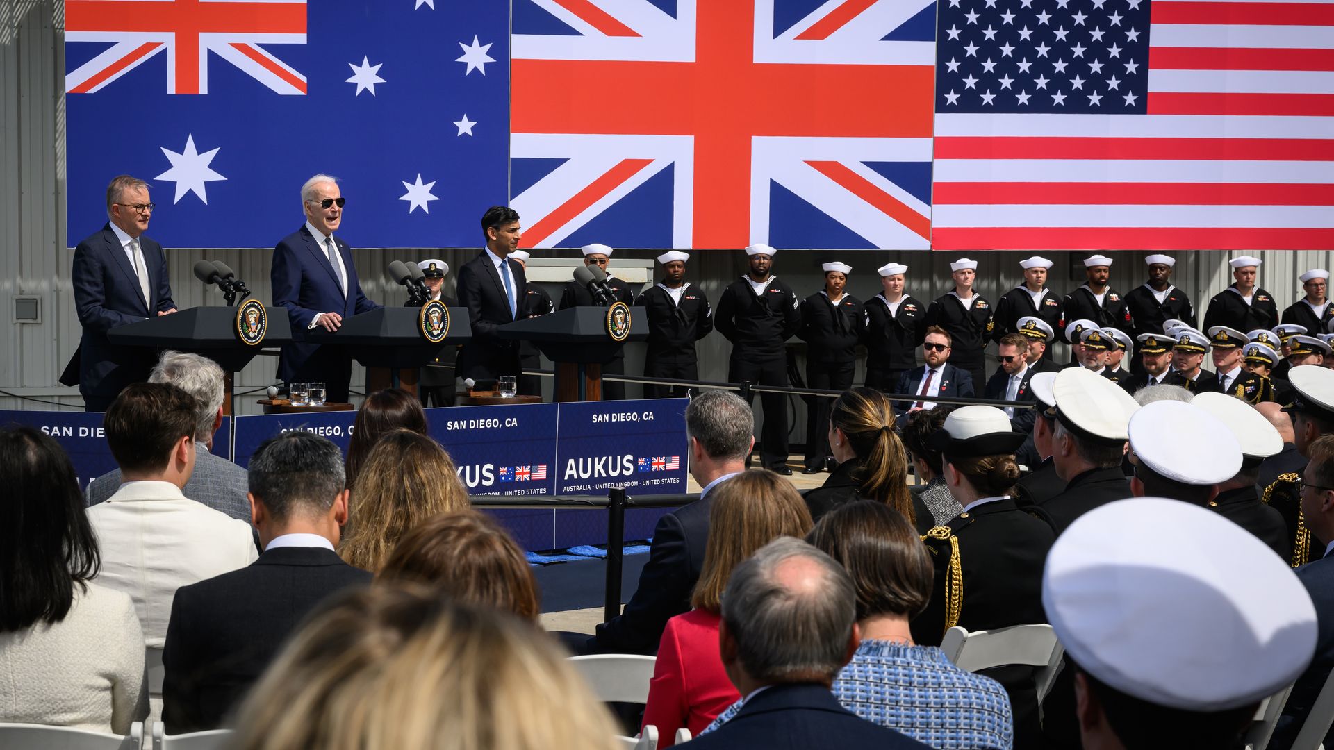 The leaders of the U.S., U.K. and Australia gathered in San Diego today to unveil the details of one big arms agreement under the AUKUS framework.