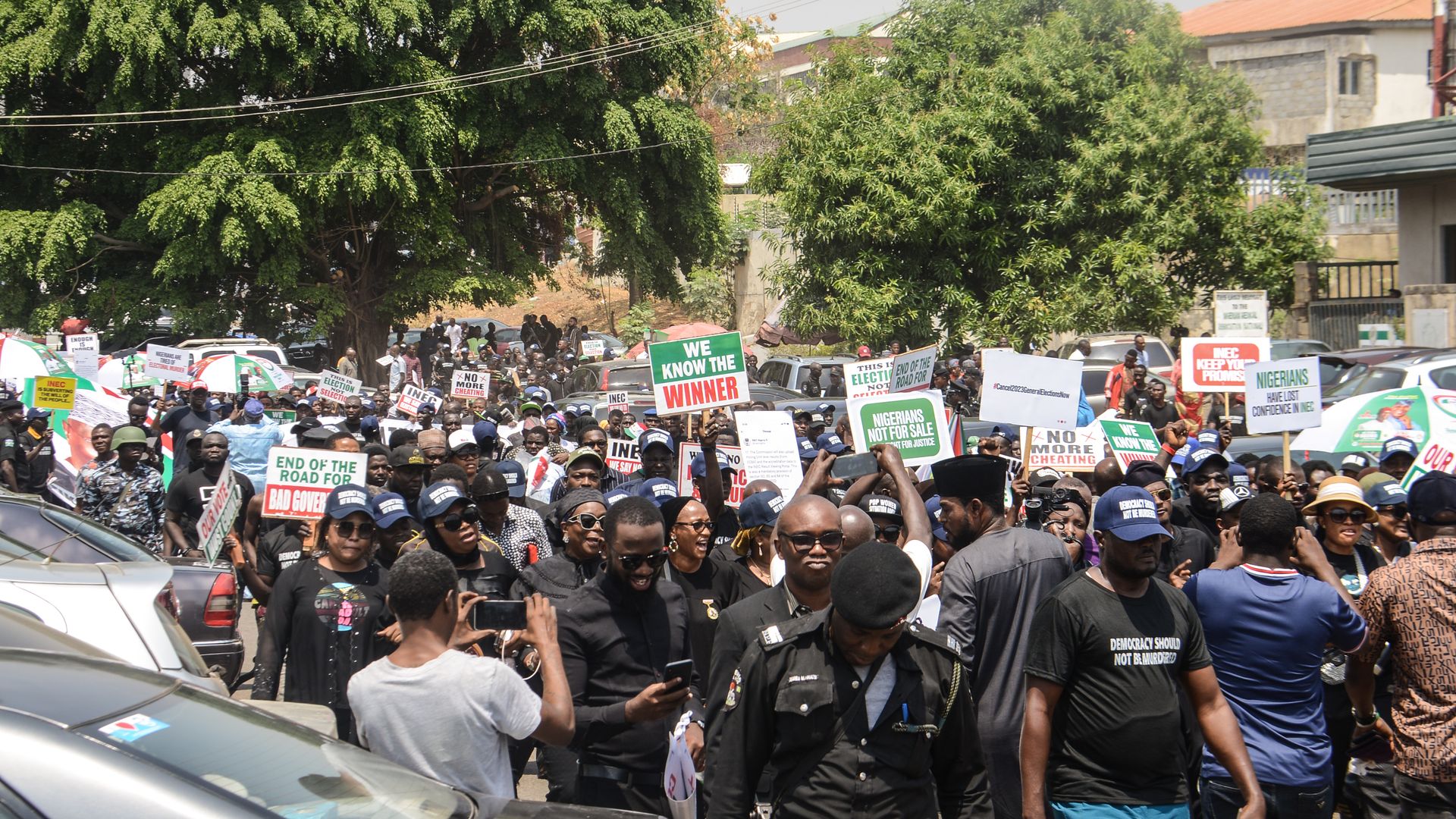 Nigerian opposition supporters protest outside the electoral commission offices in Abuja last week. Photo: Olukayode Jaiyeola/NurPhoto via Getty Images