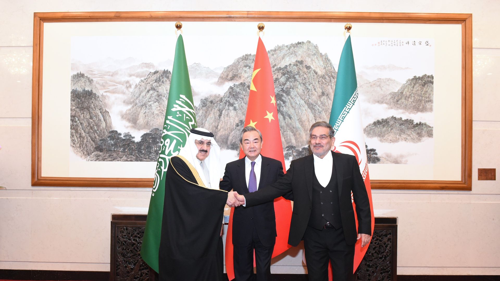 From left, Saudi national security adviser Musaid Al Aiban, Chinese top diplomat Wang Yi, and Iranian Security Council chief Ali Shamkhani pose for photos after signing the agreement. Photo: Chinese Foreign Ministry via Getty Images