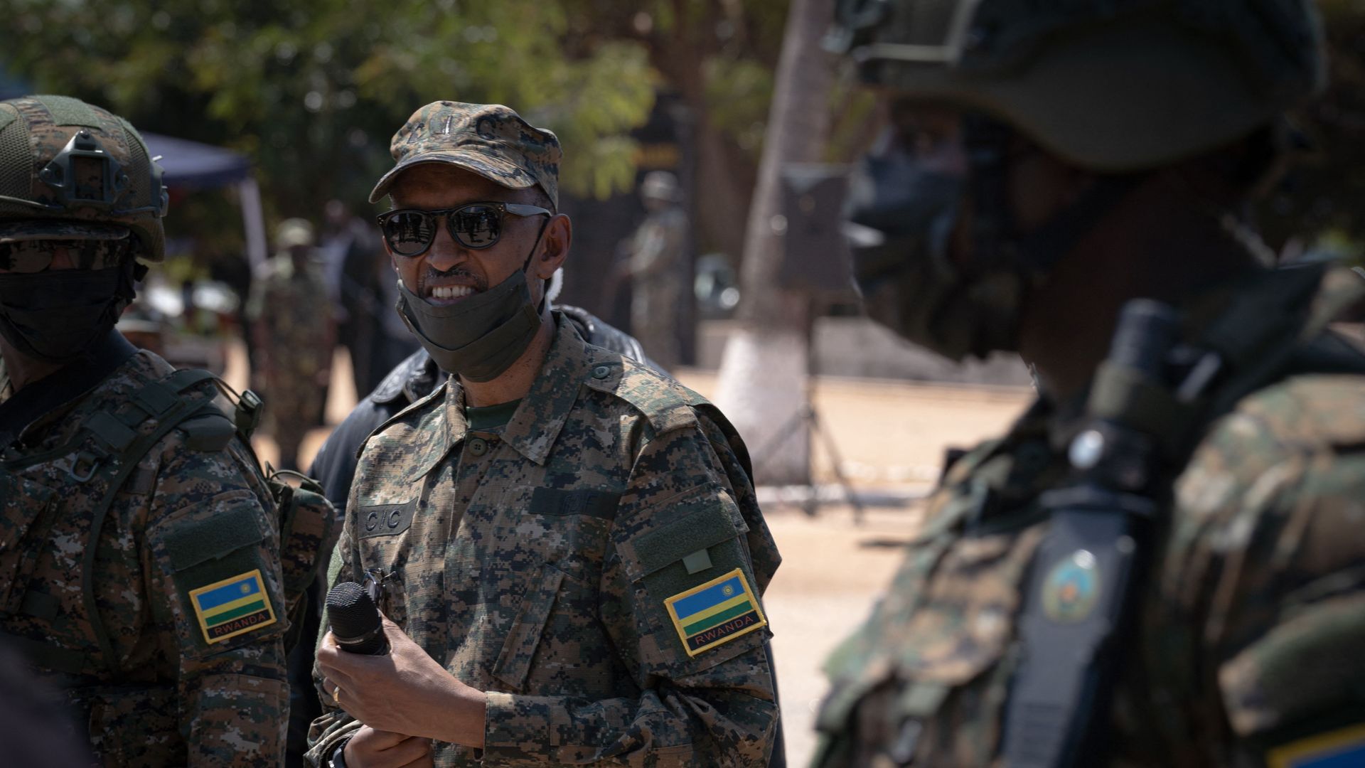 Rwandan President Paul Kagame dons military fatigues on a visit to Cabo Delgado. Photo: Imon Wohlfahrt/AFP via Getty