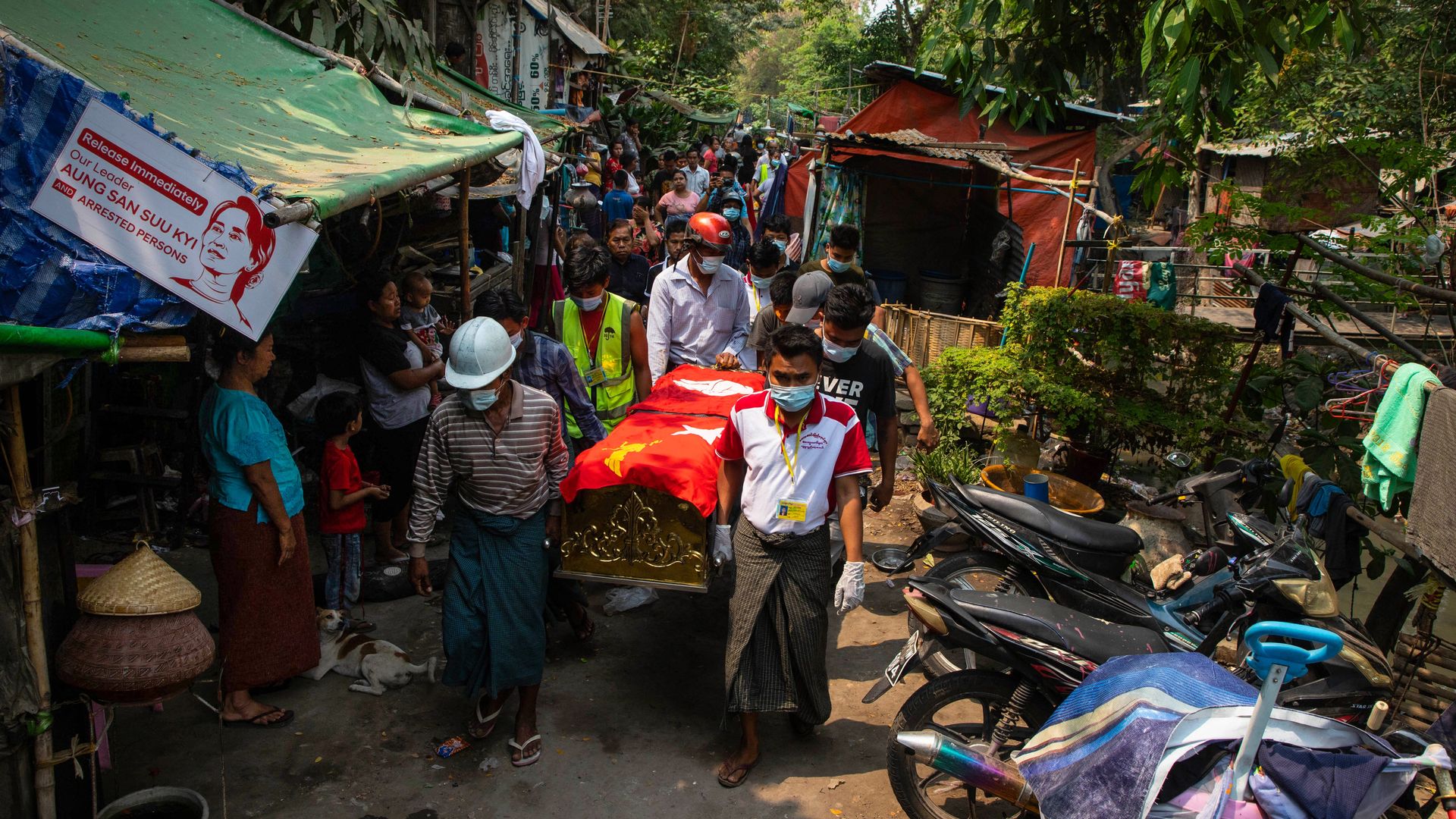 A funeral procession for Ye Swe Oo, a protester killed during Myanmar’s protests. Photo: STR/AFP via Getty