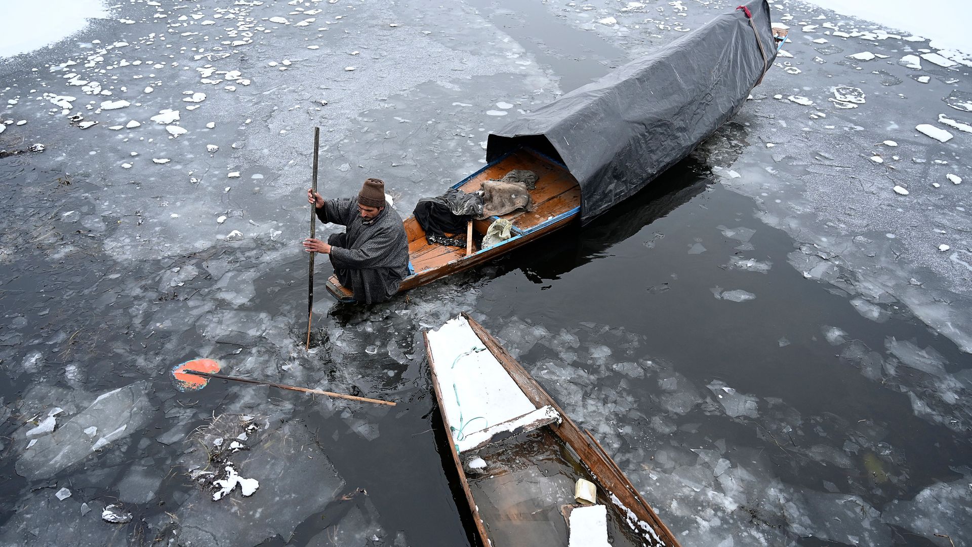 Navigating a frozen Dal Lake in Kashmir. Photo: Auseef Mustafa/AFP via Getty