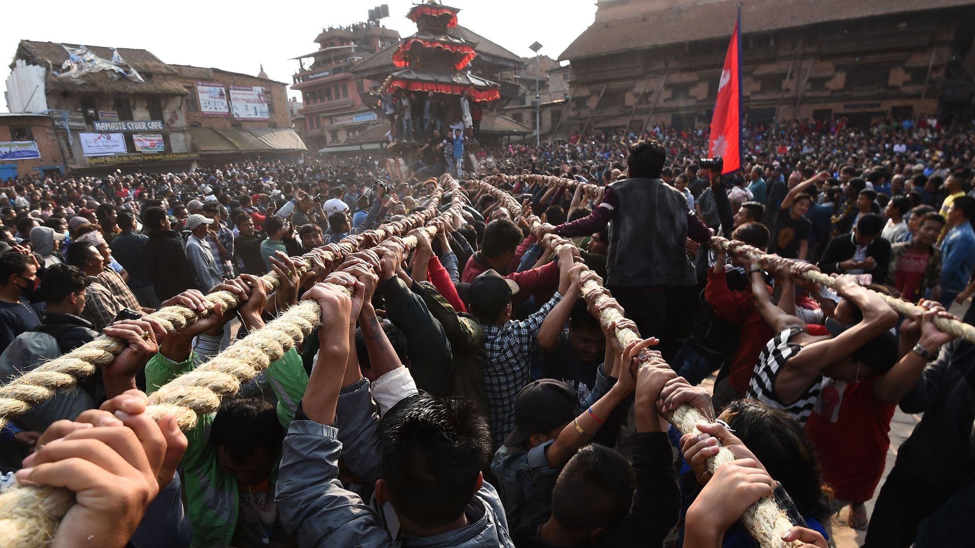 Nepali Hindu devotees pull a wooden chariot through crowds during the Bisket Jatra festival, held to mark the Nepalese New Year. Photo: Prakash Mathema/AFP/Getty Images