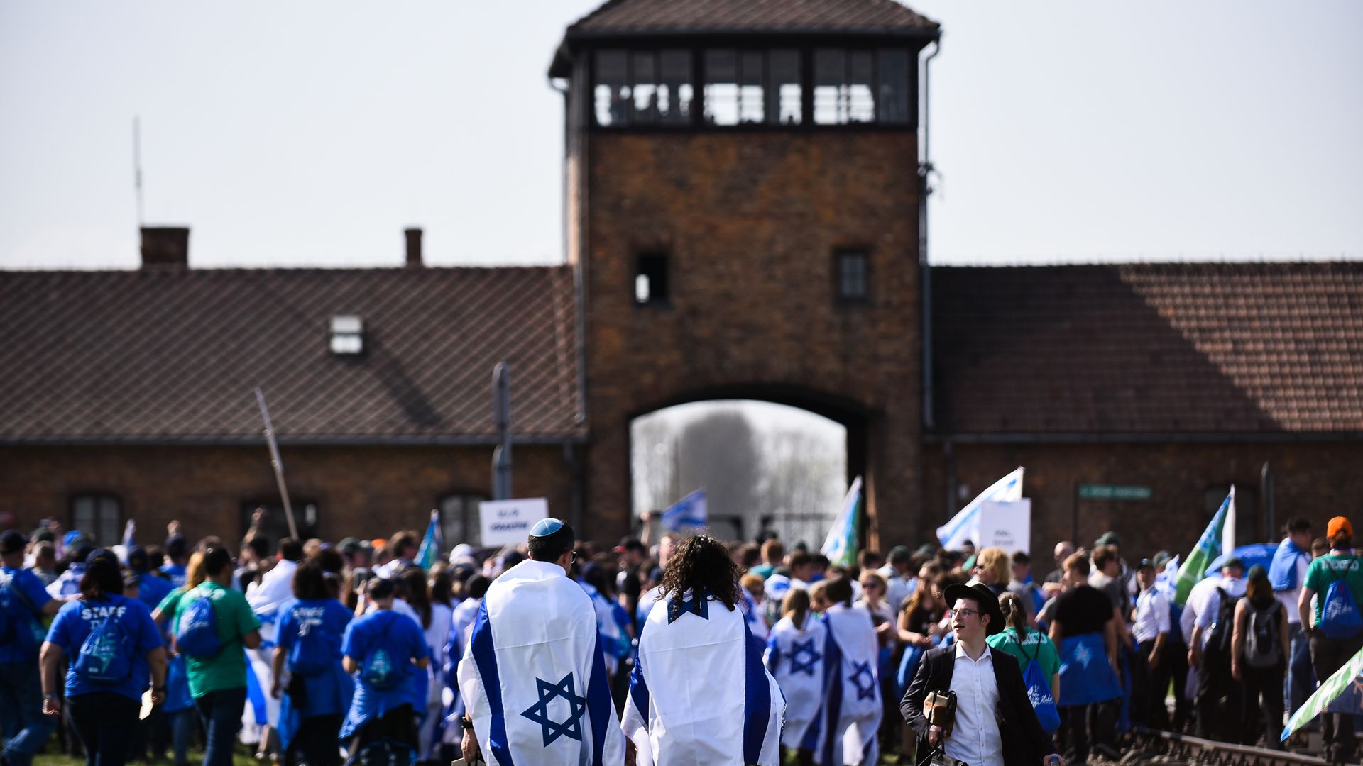 Participants wave Israeli flags at the main gate of the Auschwitz-Birkenau death camp during the 'March of the Living.' Photo: Omar Marques/SOPA Images/LightRocket via Getty Images
