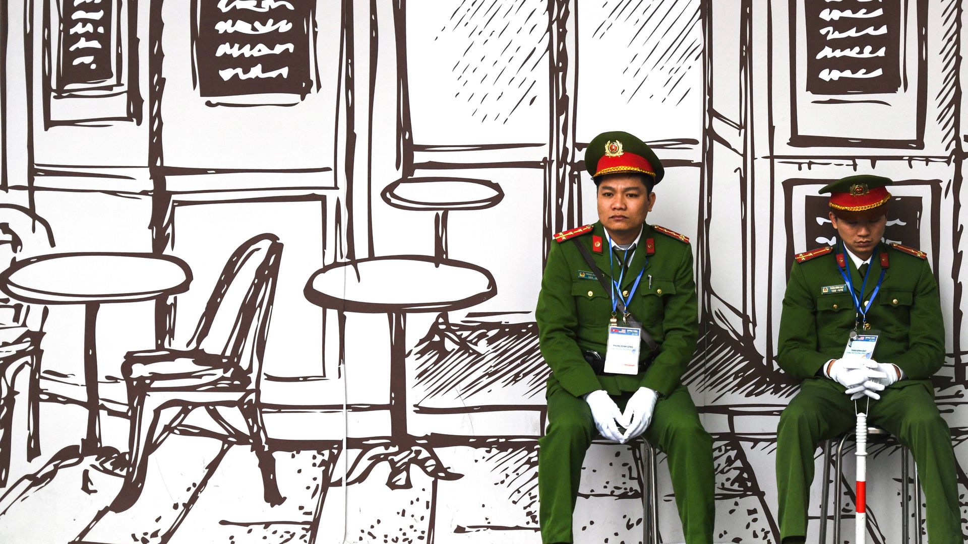 Vietnamese policemen sit on stools near Hanoi's Metropole hotel during the Trump-Kim summit. Photo: Ye Aung Thu/AFP/Getty Images