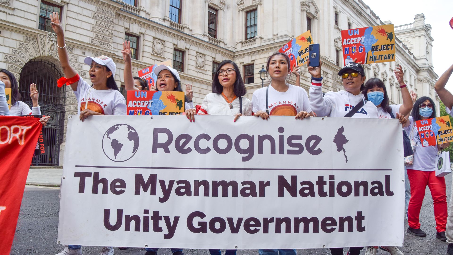 Protesters in London call for the international community to recognize Myanmar's shadow government. Photo: Vuk Valcic/SOPA Images/LightRocket via Getty