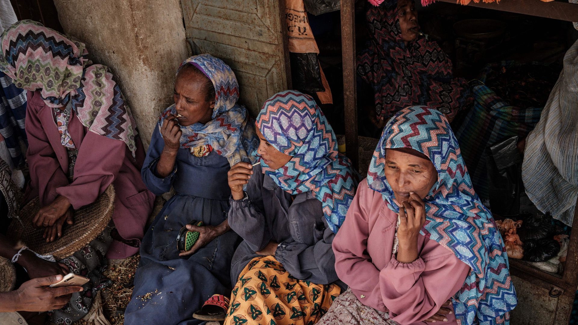 Women brush their teeth with eucalyptus branches at the Monday Market in Mekele, capital of Ethiopia's war-torn Tigray region. Photo: Yasuyoshi Chiba/AFP via Getty