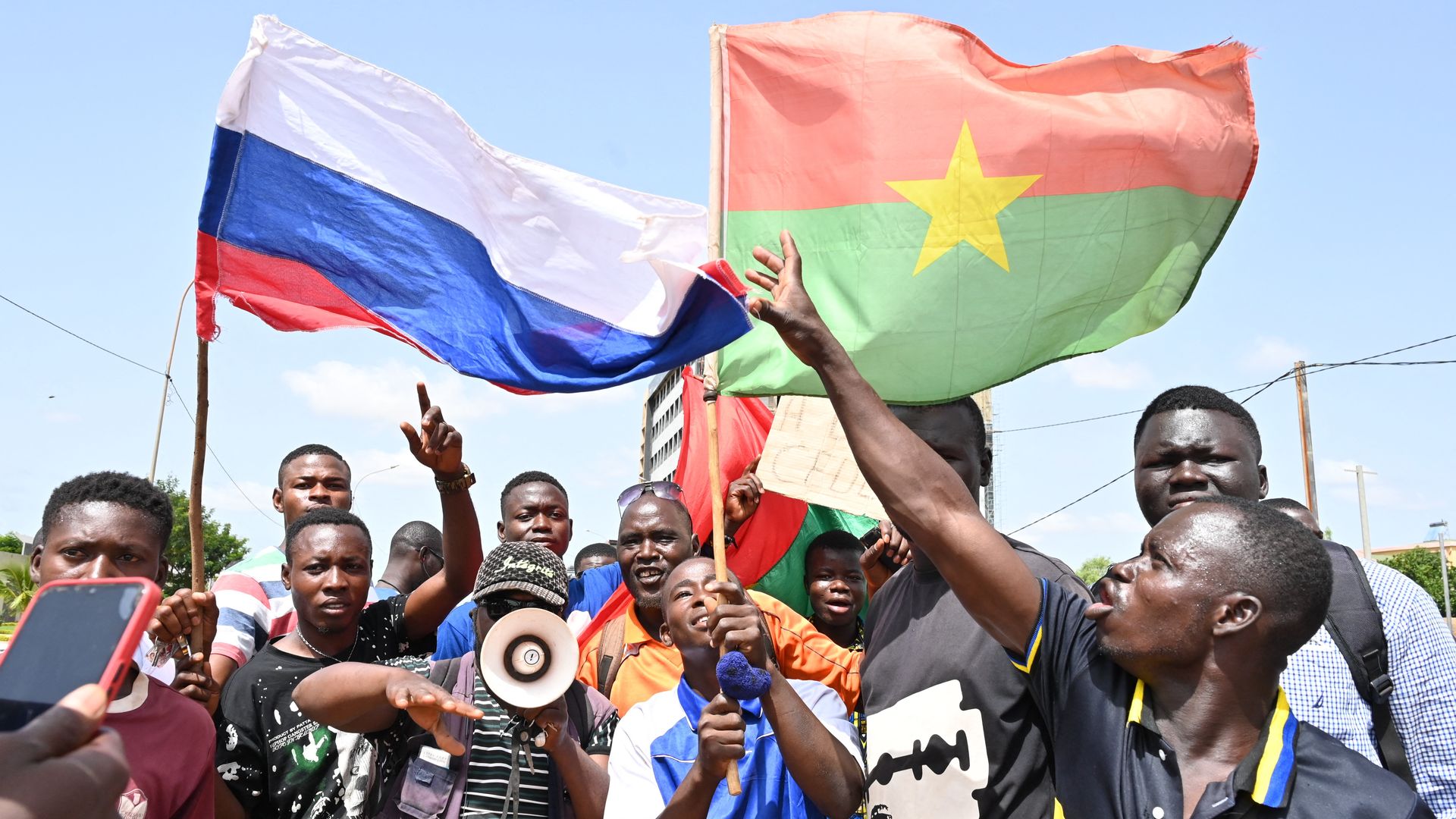 The flags of Russia and Burkina Faso are raised after a coup in Ouagadougou. Photo: Issouf Sanogo/AFP via Getty Images